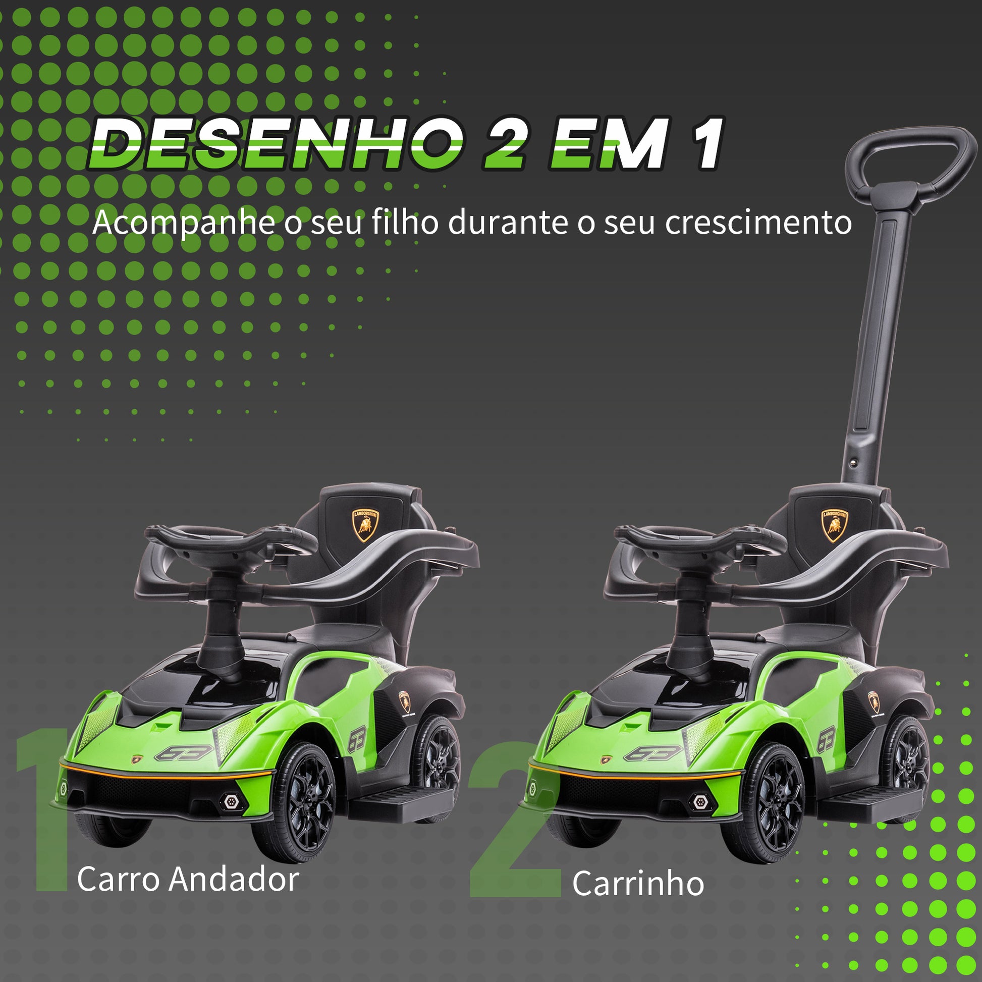 Este Carro Andador 2 em 1 é perfeito para crianças de 12 a 36 meses, com medidas de 86,5x40x89,5 cm e na cor verde.