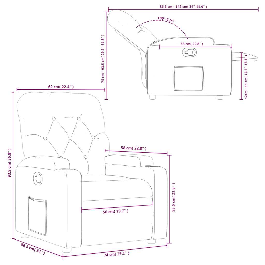 - Função de reclinação manual: esta poltrona reclinável possui uma pega no lado direito. Pode ajustar manualmente o encosto e o apoio de pés em qualquer posição, de acordo com as suas necessidades de conforto, ao puxar a pega. Este recurso permite uma inclinação máxima de 135 graus. Além disso, o encosto pode voltar para a posição original rápida e facilmente se puxar a pega.