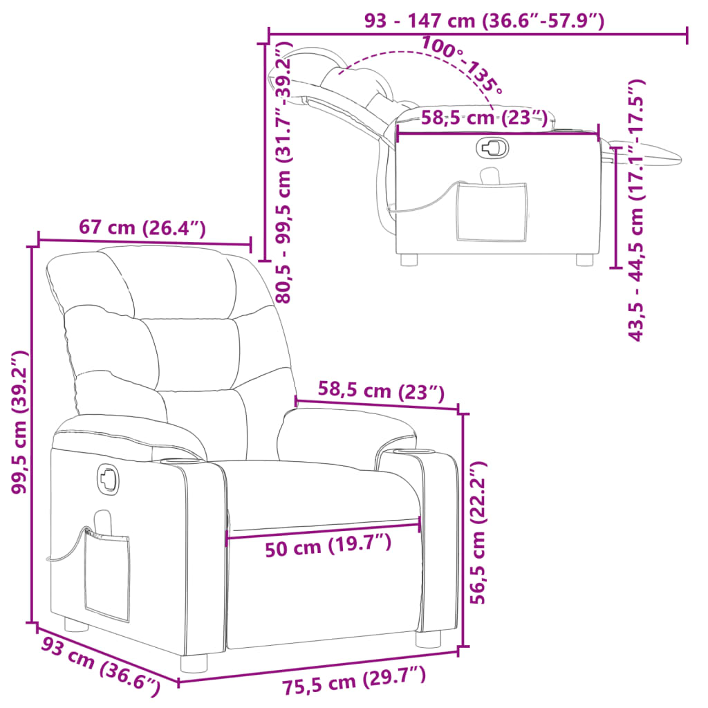- Função de reclinação manual: esta poltrona reclinável possui uma pega no lado direito. Pode ajustar manualmente o encosto e o apoio de pés em qualquer posição, de acordo com as suas necessidades de conforto, ao puxar a pega. Este recurso permite uma inclinação máxima de 135 graus. Além disso, o encosto pode voltar para a posição original rápida e facilmente se puxar a pega.