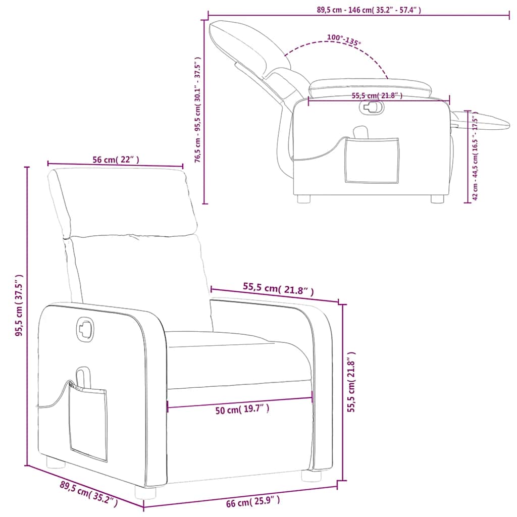 - Função de reclinação manual: esta poltrona reclinável possui uma pega no lado direito. Pode ajustar manualmente o encosto e o apoio de pés em qualquer posição, de acordo com as suas necessidades de conforto, ao puxar a pega. Este recurso permite uma inclinação máxima de 135 graus. Além disso, o encosto pode voltar para a posição original rápida e facilmente se puxar a pega.