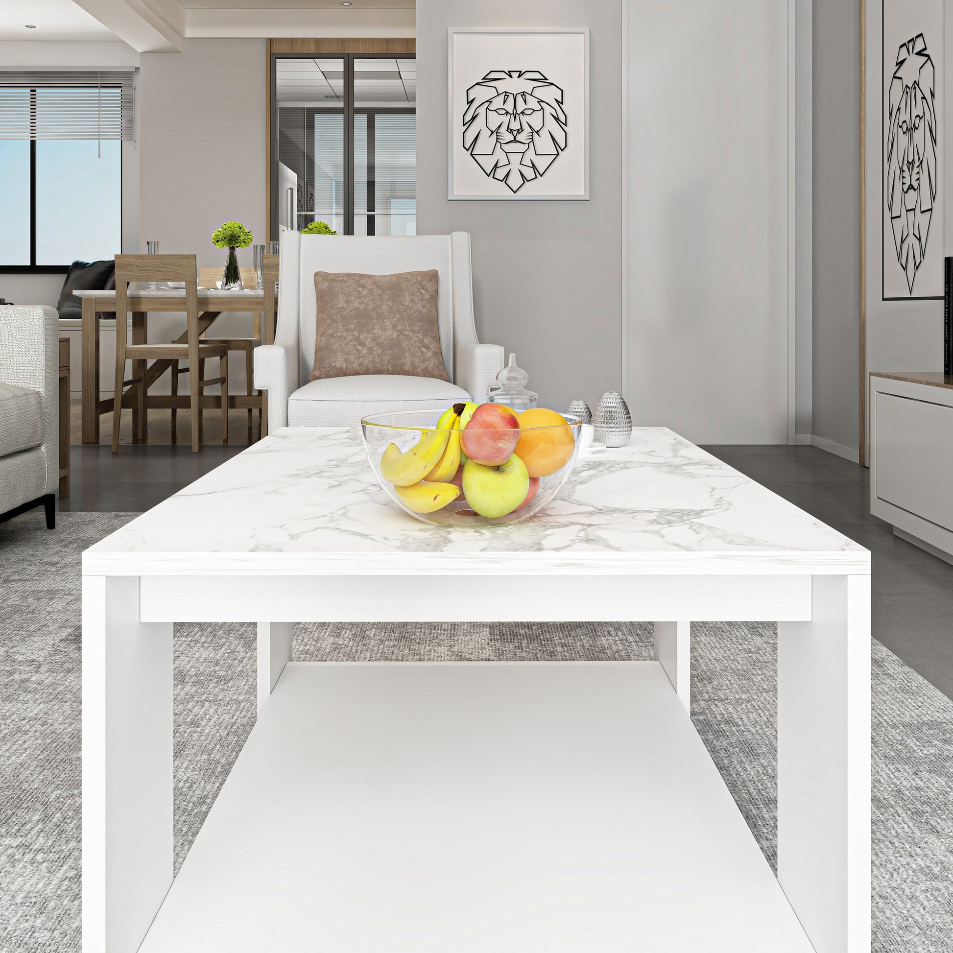 Delicie-se com o luxo e a funcionalidade da nossa mesa de centro em mármore branco e transforme a sua sala de estar num refúgio de estilo e conforto. Encomende agora e experimente a mistura perfeita de elegância e durabilidade!