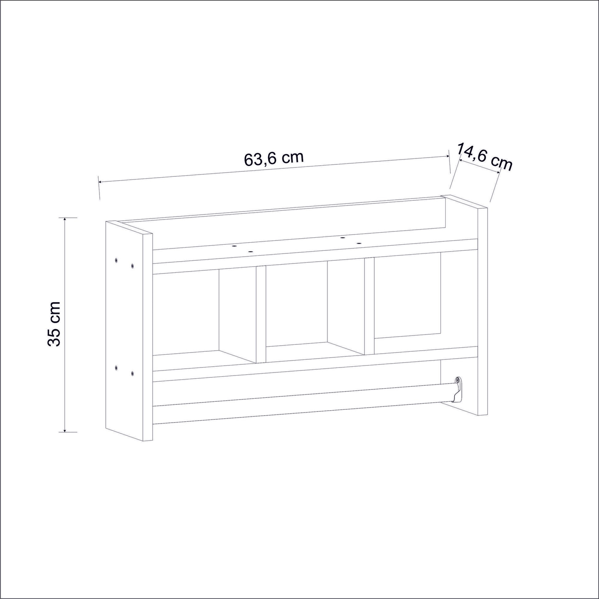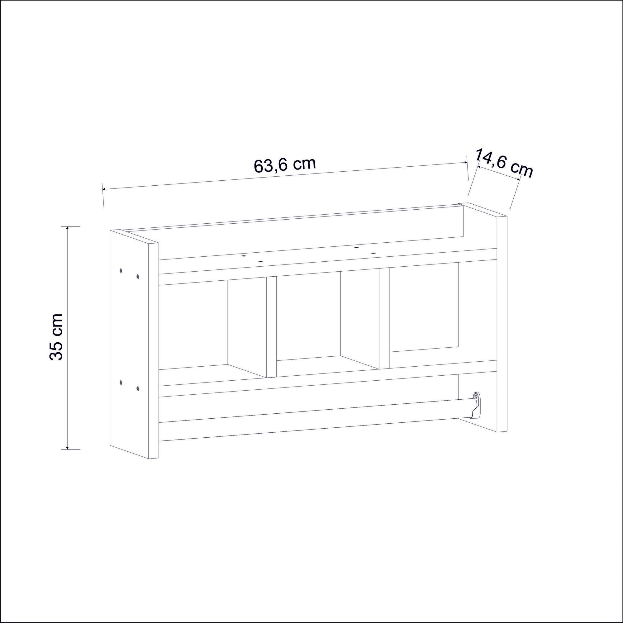 Instalar a nossa prateleira de parede Sapphire é muito fácil. Com as suas dimensões exactas de 63,6 cm de largura, 35 cm de altura e 14,6 cm de profundidade, adapta-se perfeitamente à parede. 6cm de profundidade, adapta-se na perfeição a qualquer parede. A embalagem inclui todo o hardware necessário e instruções passo-a-passo, tornando a instalação rápida e sem complicações.