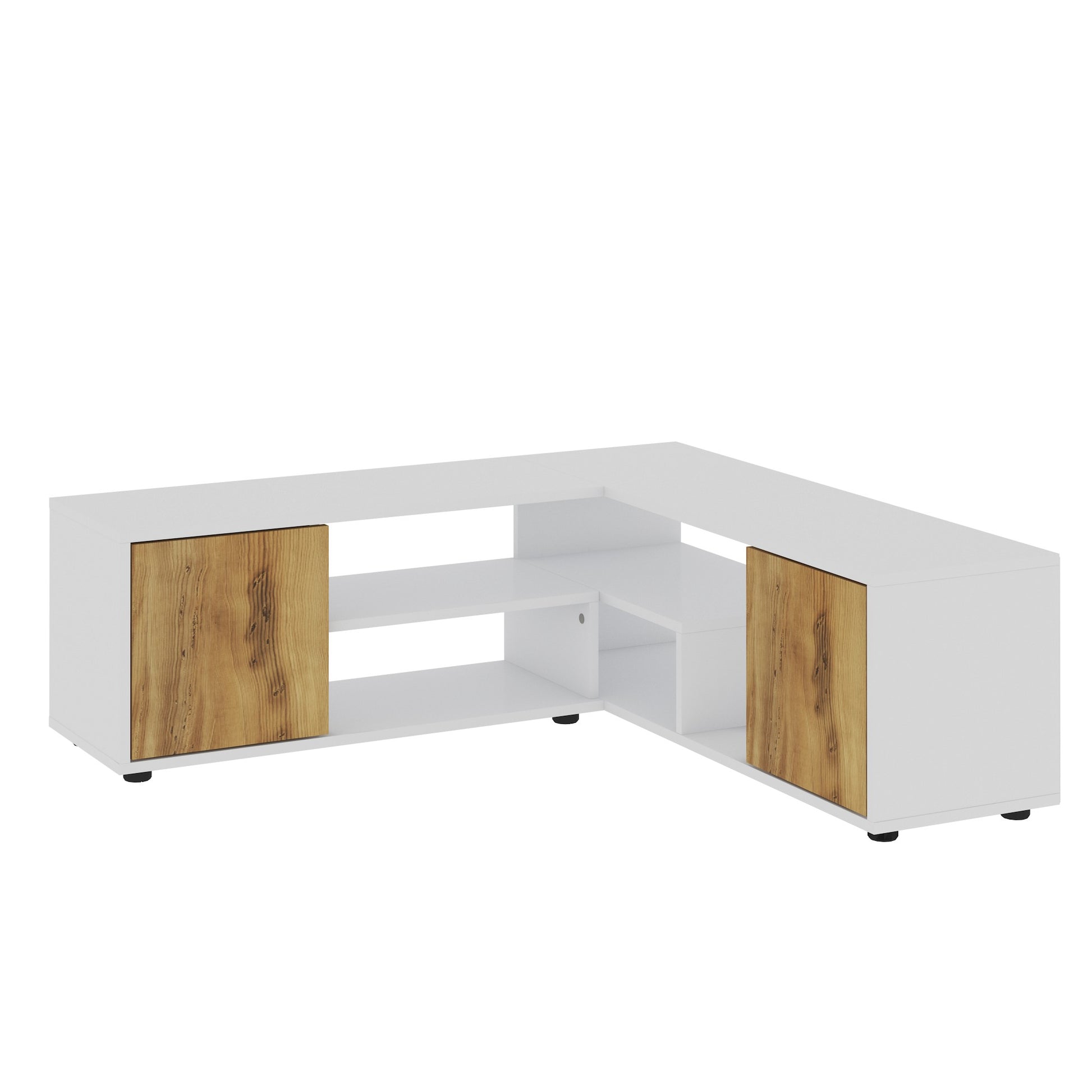 Com as suas linhas simples e o seu acabamento contemporâneo, este suporte para televisor irá melhorar instantaneamente a estética de qualquer divisão. A combinação das cores branco e carvalho acrescenta um toque de sofisticação, tornando-o o complemento perfeito para a decoração da sua casa.