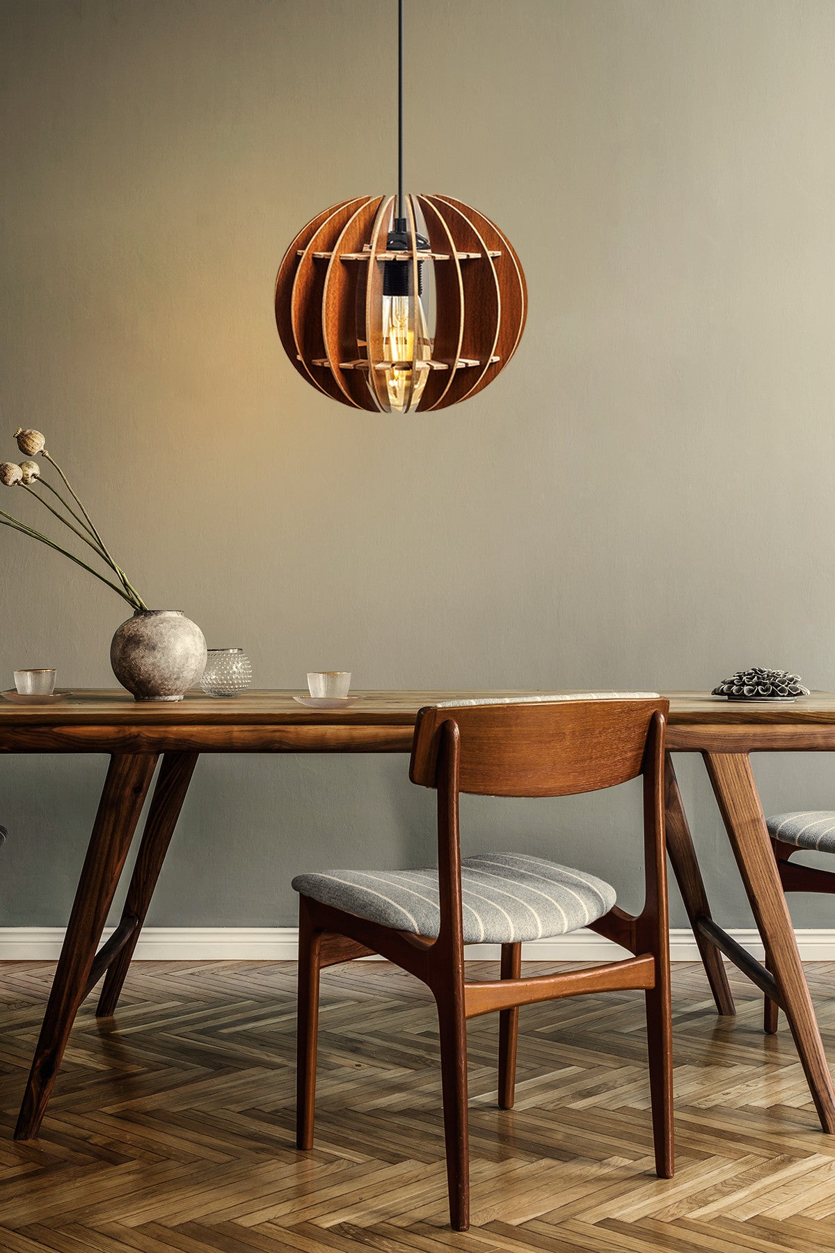 Transforme seu espaço de vida com nosso deslumbrante Lustre Esfera de Design Especial. Este lustre requintado apresenta um corpo único em MDF na rica cor Nogueira, adicionando um toque de elegância e sofisticação a qualquer ambiente. O cabo ajustável permite que você personalize a altura para se adequar perfeitamente ao seu espaço, enquanto a cor sólida e o design escandinavo trazem um toque moderno e estiloso à sua decoração.