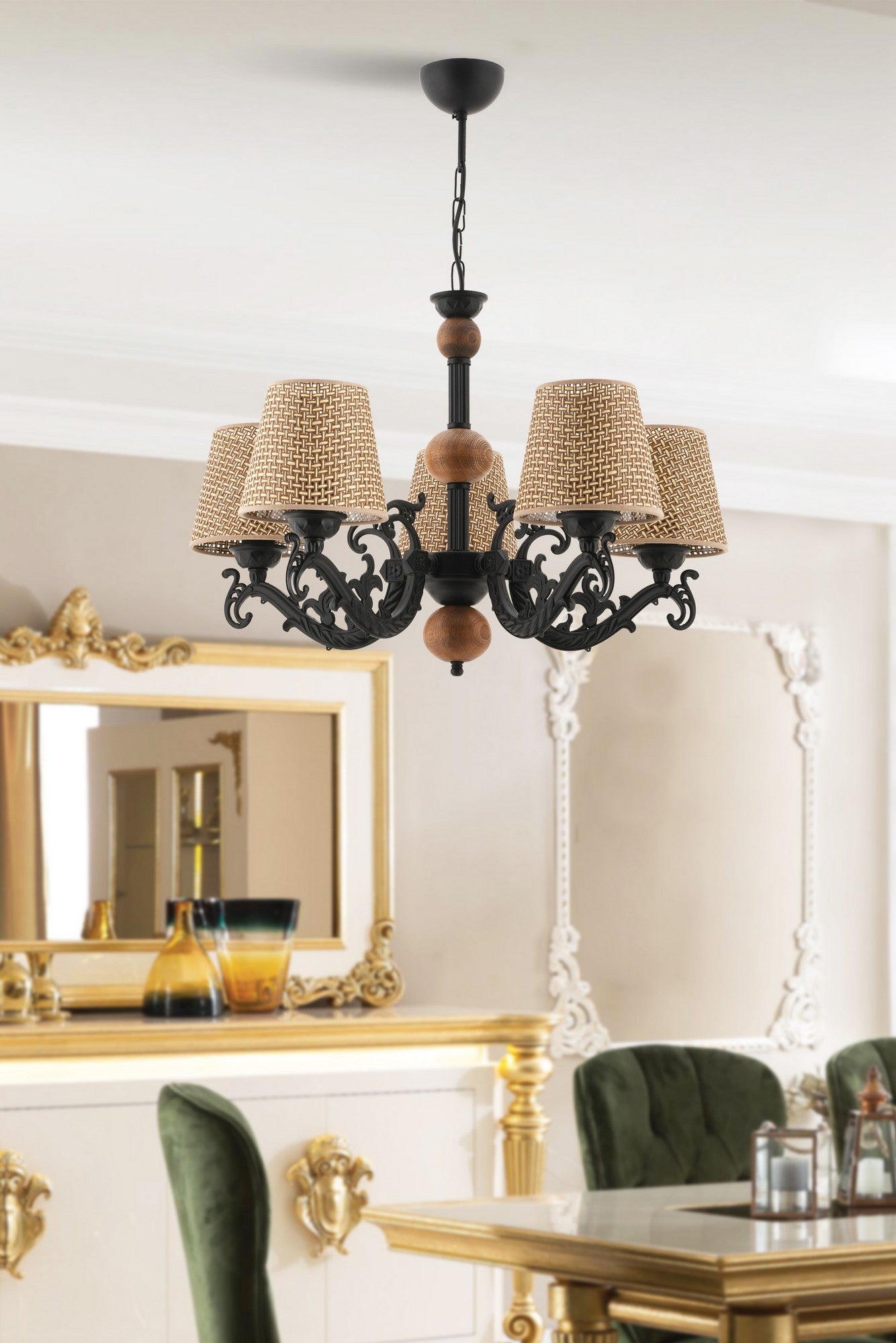 O brilho suave das cinco lâmpadas e27 (não incluídas) iluminará a sua divisão com uma luz quente e convidativa, perfeita para noites relaxantes em casa ou para receber convidados. A altura total do candeeiro de 65 cm e o diâmetro de 55 cm tornam-no no tamanho perfeito para qualquer divisão, acrescentando um toque de sofisticação sem sobrecarregar o espaço.