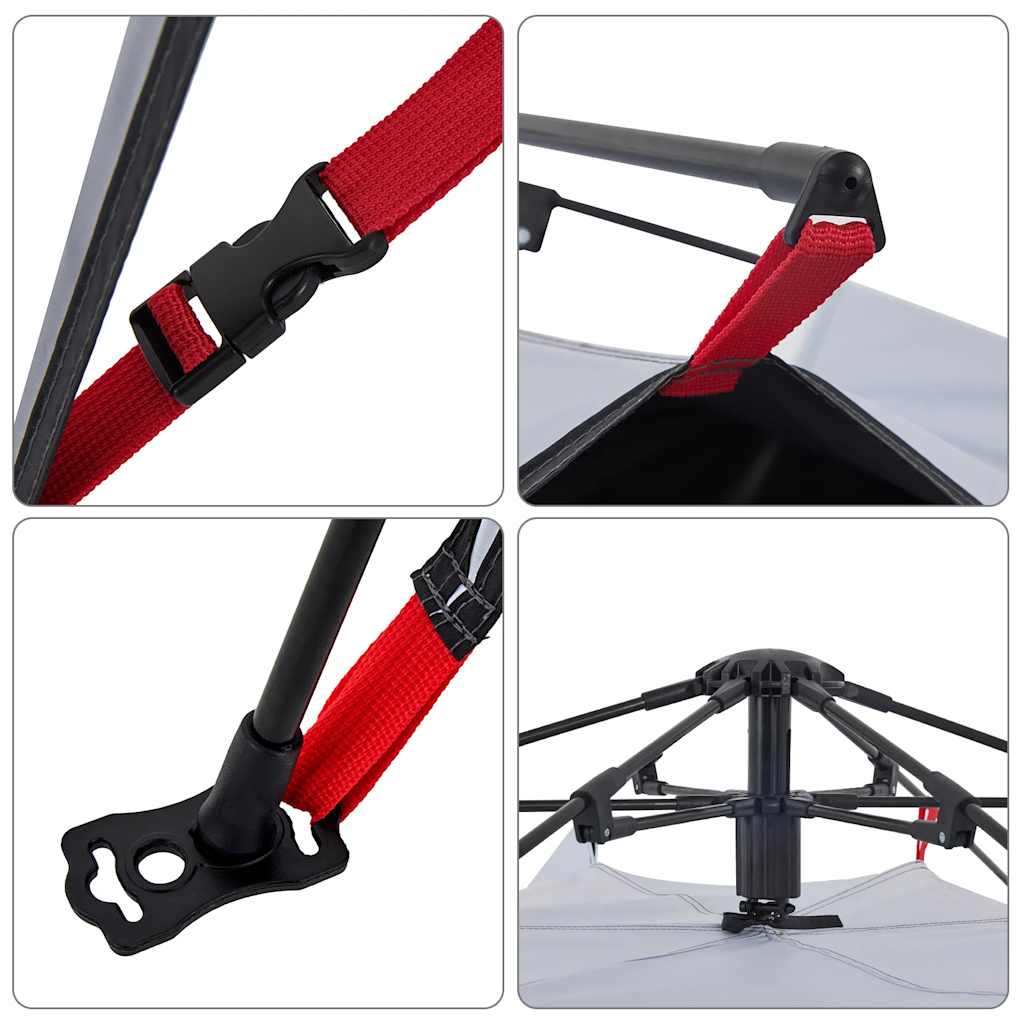 - Sistema de libertação rápida: configure a tenda sem esforço com o sistema de libertação rápida! Deite a tenda, estenda os postes pré-montados até que se fixem no devido lugar e está pronta!