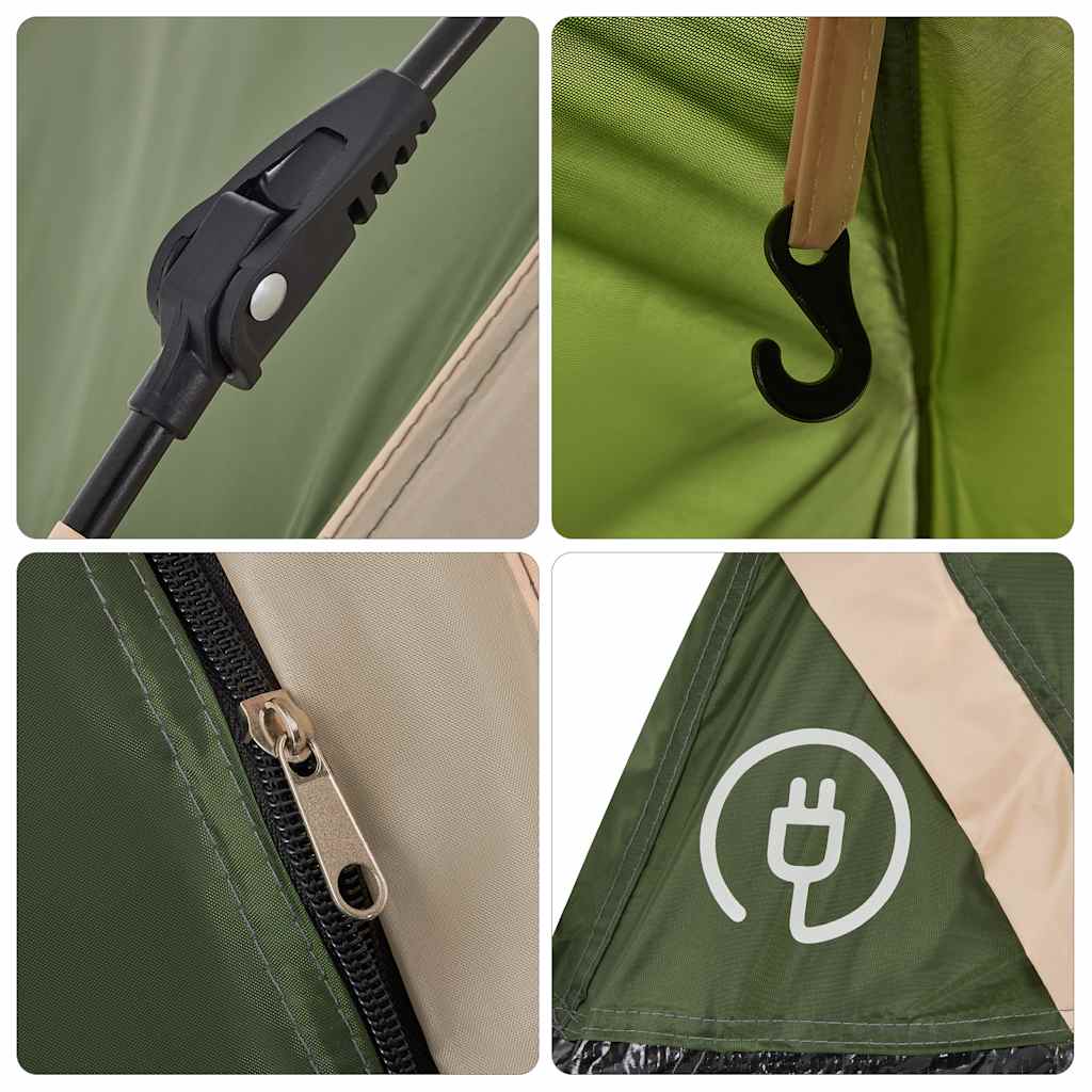 - Acesso conveniente para cabo elétrico: a porta E permite-lhe ligar facilmente um cabo de extensão de uma fonte de alimentação externa à sua tenda.