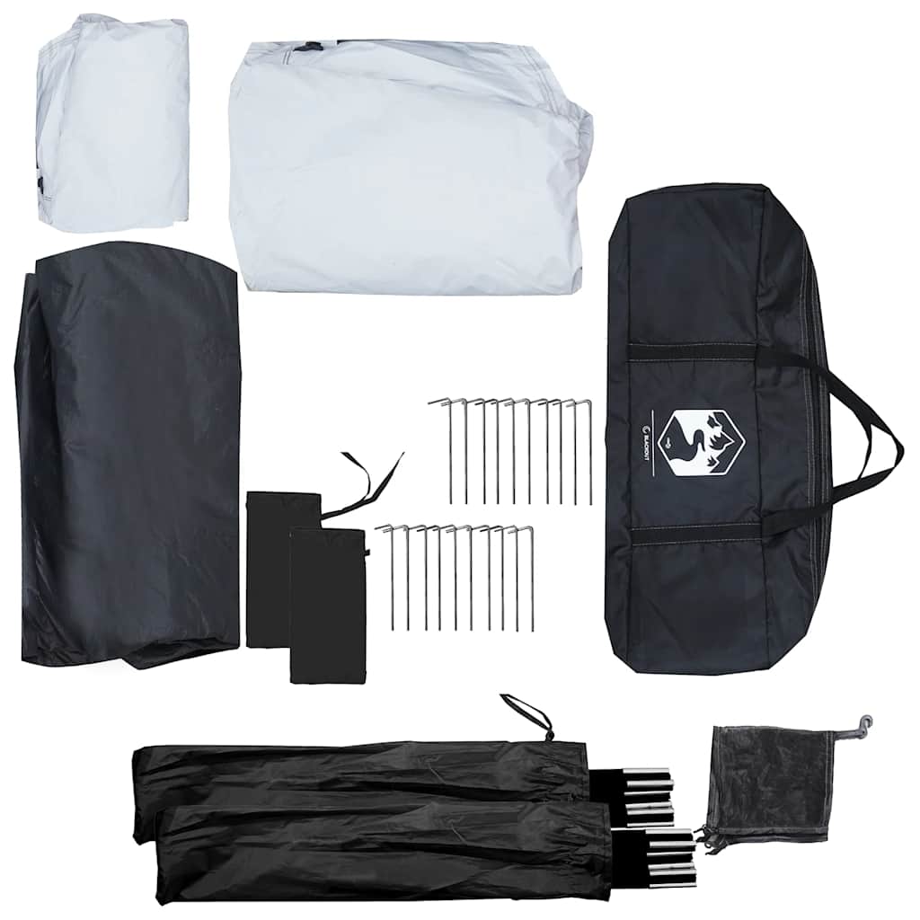- Fácil montagem e desmontagem: montar e desmontar a tenda é muito fácil graças aos postes de fibra de vidro altamente flexíveis e leves e ao conveniente sistema de conexão por pinos e anéis.