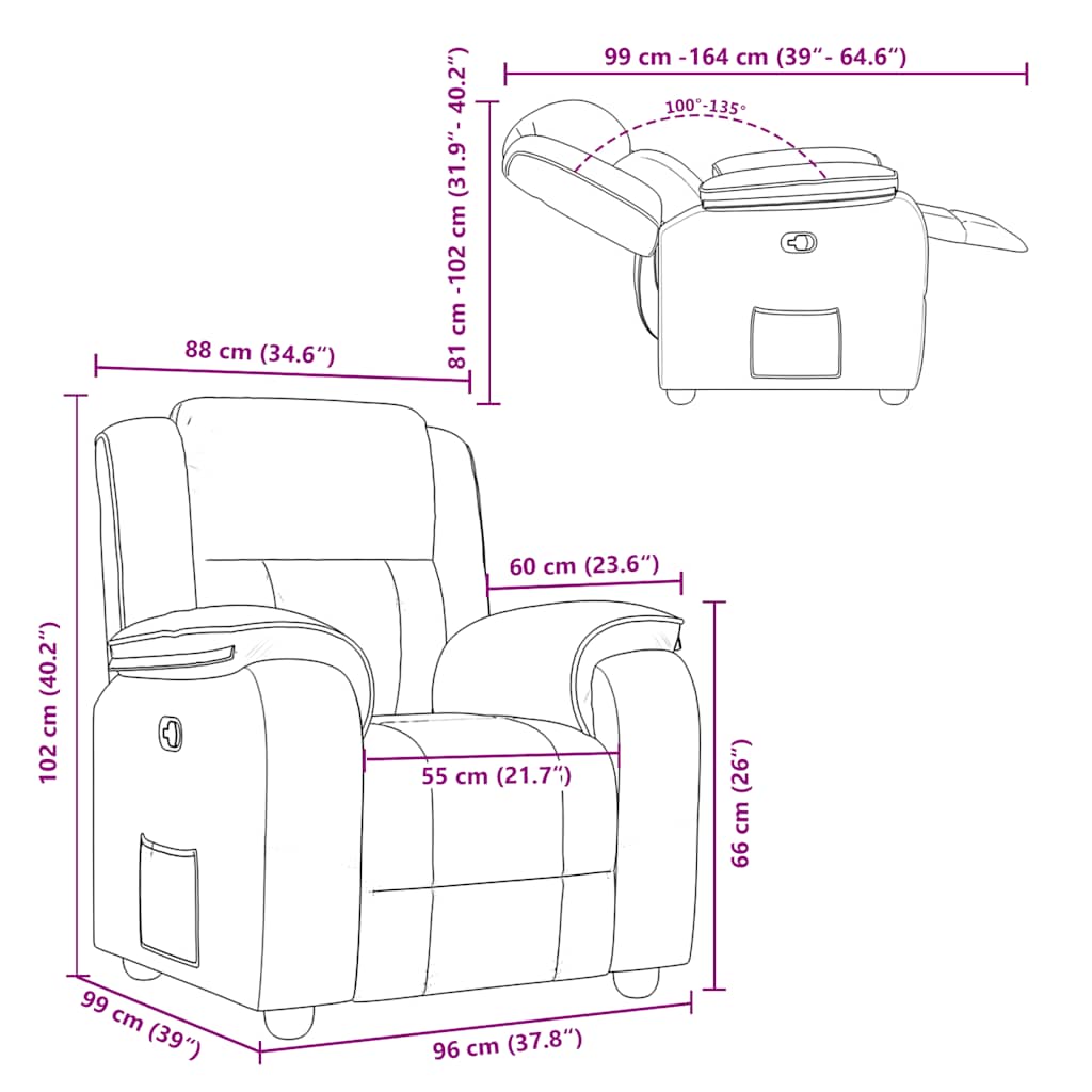 - Dimensões na posição sentada: 96 x 99 x 102 cm (L x P x A)