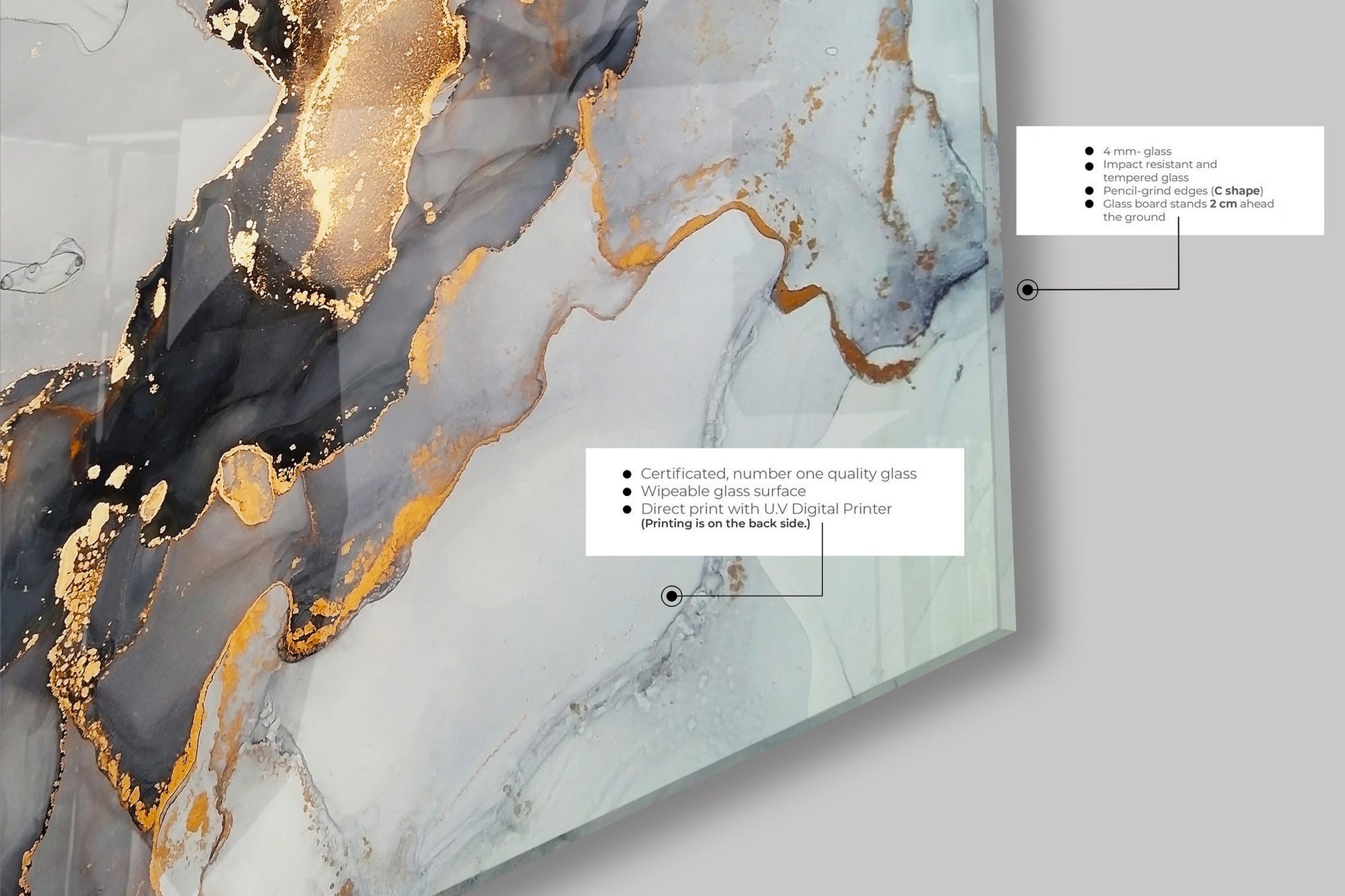 O vidro temperado não é apenas esteticamente superior - é também 5 vezes mais resistente que o vidro comum, tornando-o a escolha ideal para decoração duradoura. A sua superfície não porosa resiste a manchas e é extremamente fácil de limpar, mantendo o brilho e a intensidade das cores intactas ao longo do tempo.