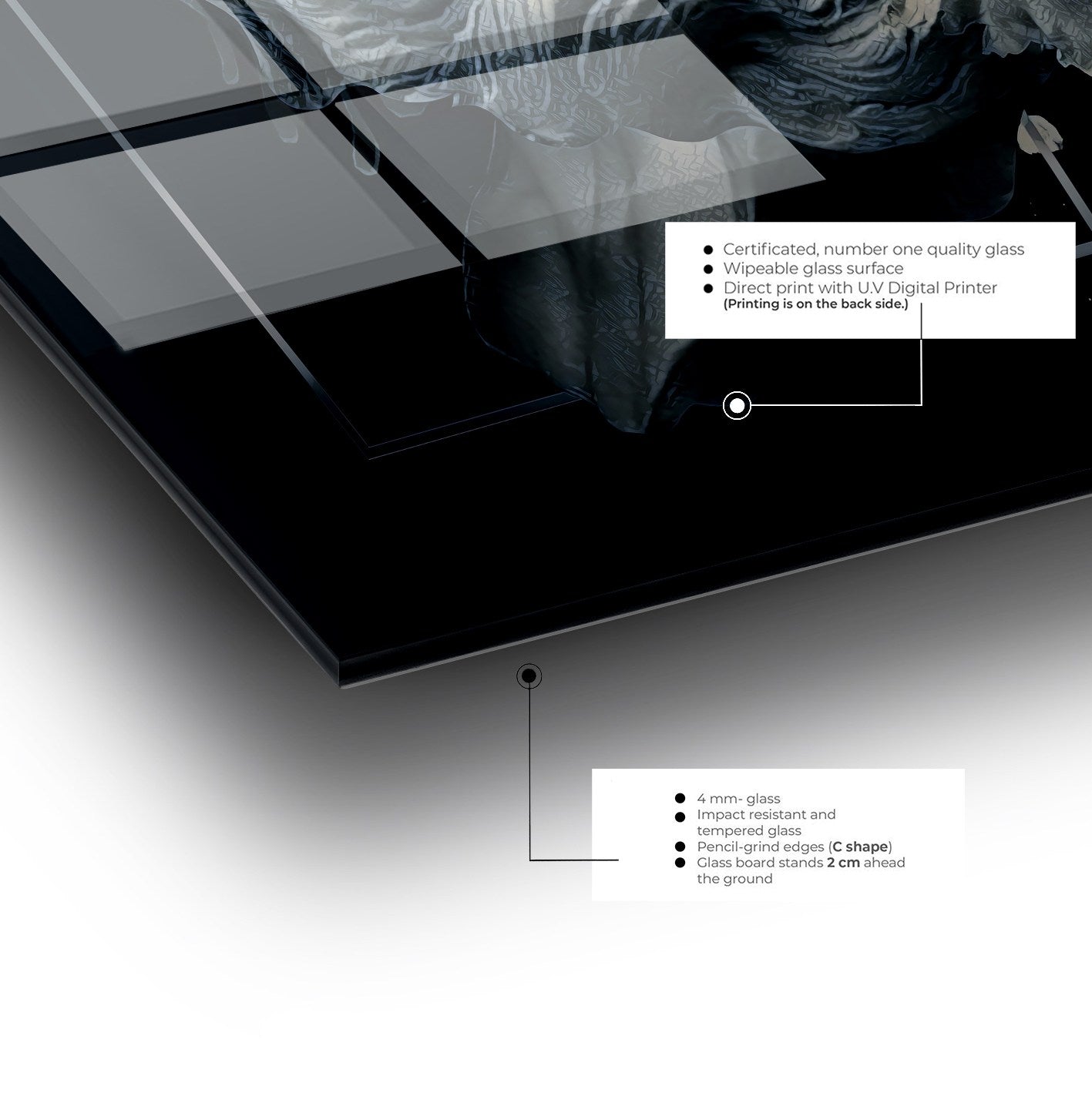 Fabricado em 100% vidro temperado de 4mm de espessura, este quadro decorativo não é apenas visualmente deslumbrante – é construído para durar. O vidro temperado oferece resistência superior a impactos e variações de temperatura, garantindo que a sua obra de arte permanece impecável ao longo dos anos.