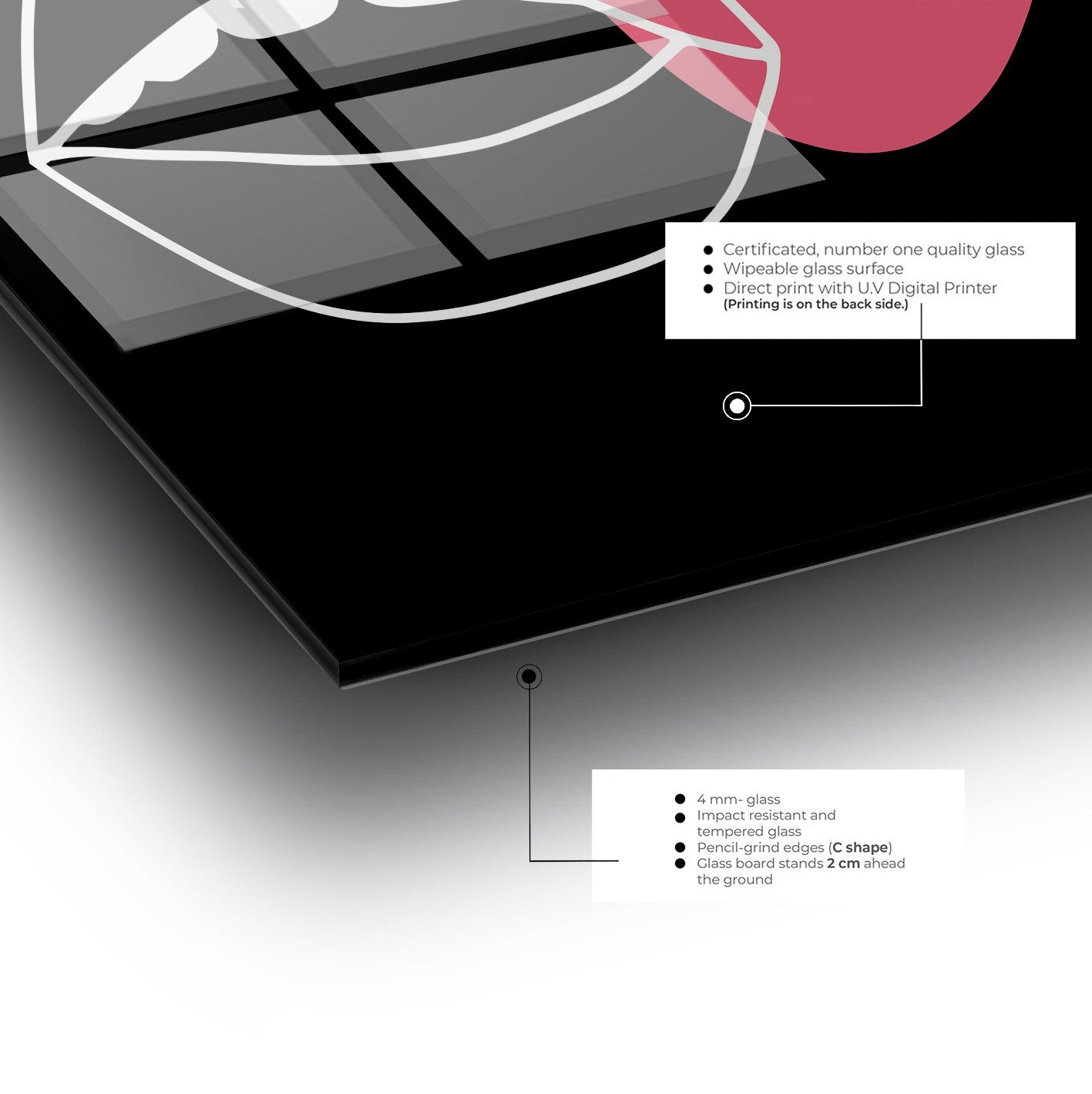 Fabricado em 100% vidro temperado de 4mm de espessura, este quadro decorativo não é apenas visualmente impressionante – é construído para durar. O vidro temperado oferece resistência superior a impactos e variações de temperatura, garantindo que a sua obra de arte permanece impecável ao longo dos anos.