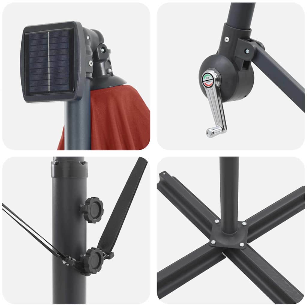 - Iluminação Solar Ecológica Ilumine suas reuniões noturnas com os LEDs solares integrados localizados em cada viga do guarda-sol. Essas luzes energeticamente eficientes oferecem um ambiente encantador, permitindo que você estenda seu prazer ao ar livre pela noite com impacto ambiental mínimo.