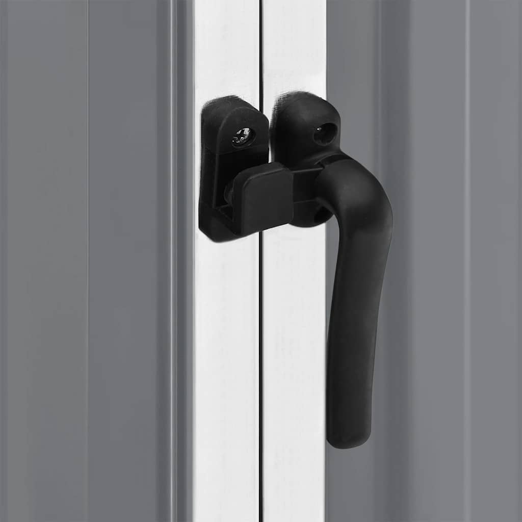 Este abrigo de arrumação para exterior é feito de aço galvanizado, requer uma manutenção mínima e é muito durável. As portas de abertura dupla na frente permitem uma fácil entrada e saída. Graças ao seu design inclinado, a água da chuva é drenada automaticamente do telhado.