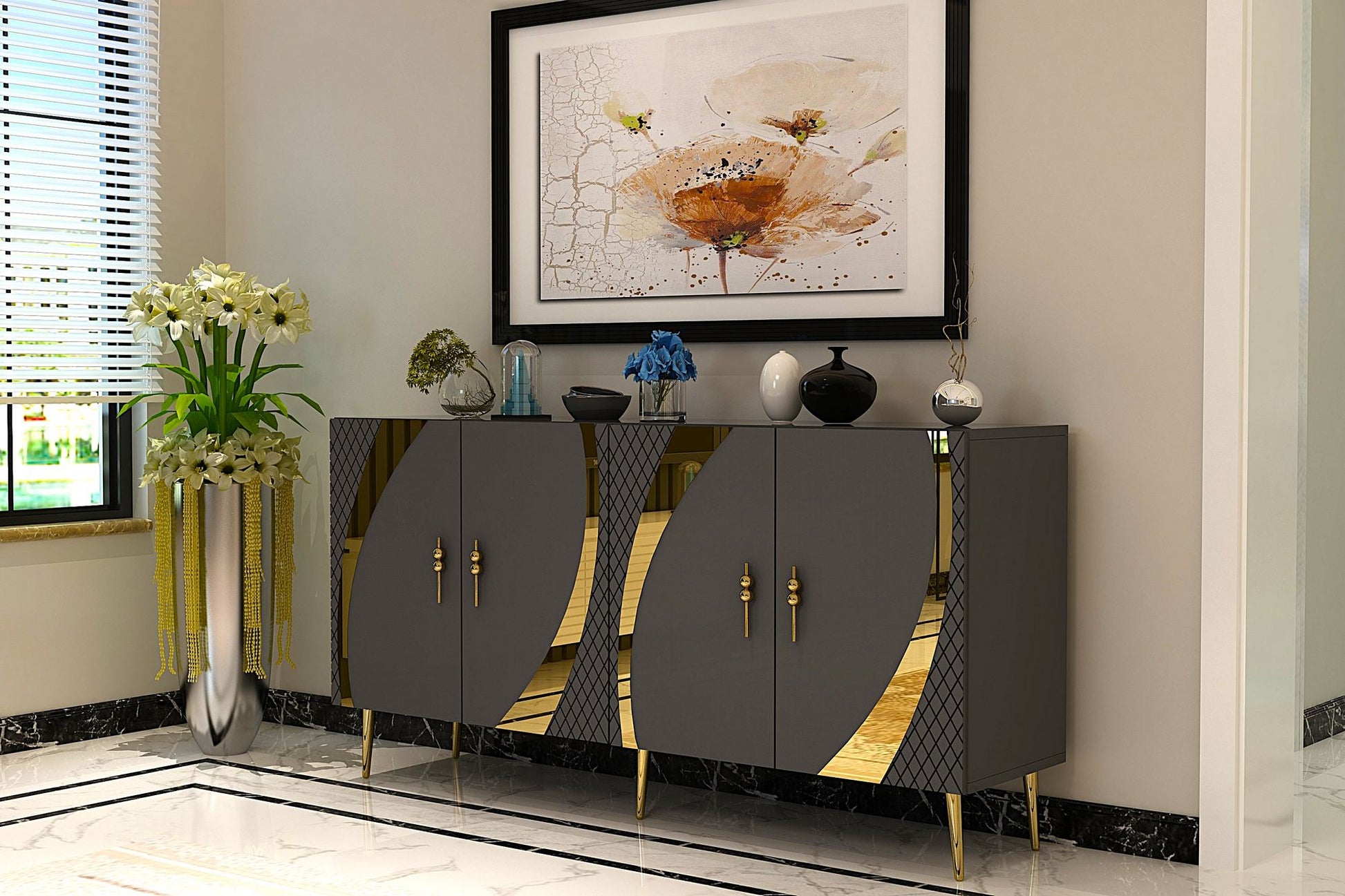 O design elegante desta consola, com a sua combinação de cores antracite e dourado, irá elevar instantaneamente o aspeto de qualquer divisão. A mistura perfeita de moderno e clássico, esta consola será certamente o ponto focal da sua decoração.