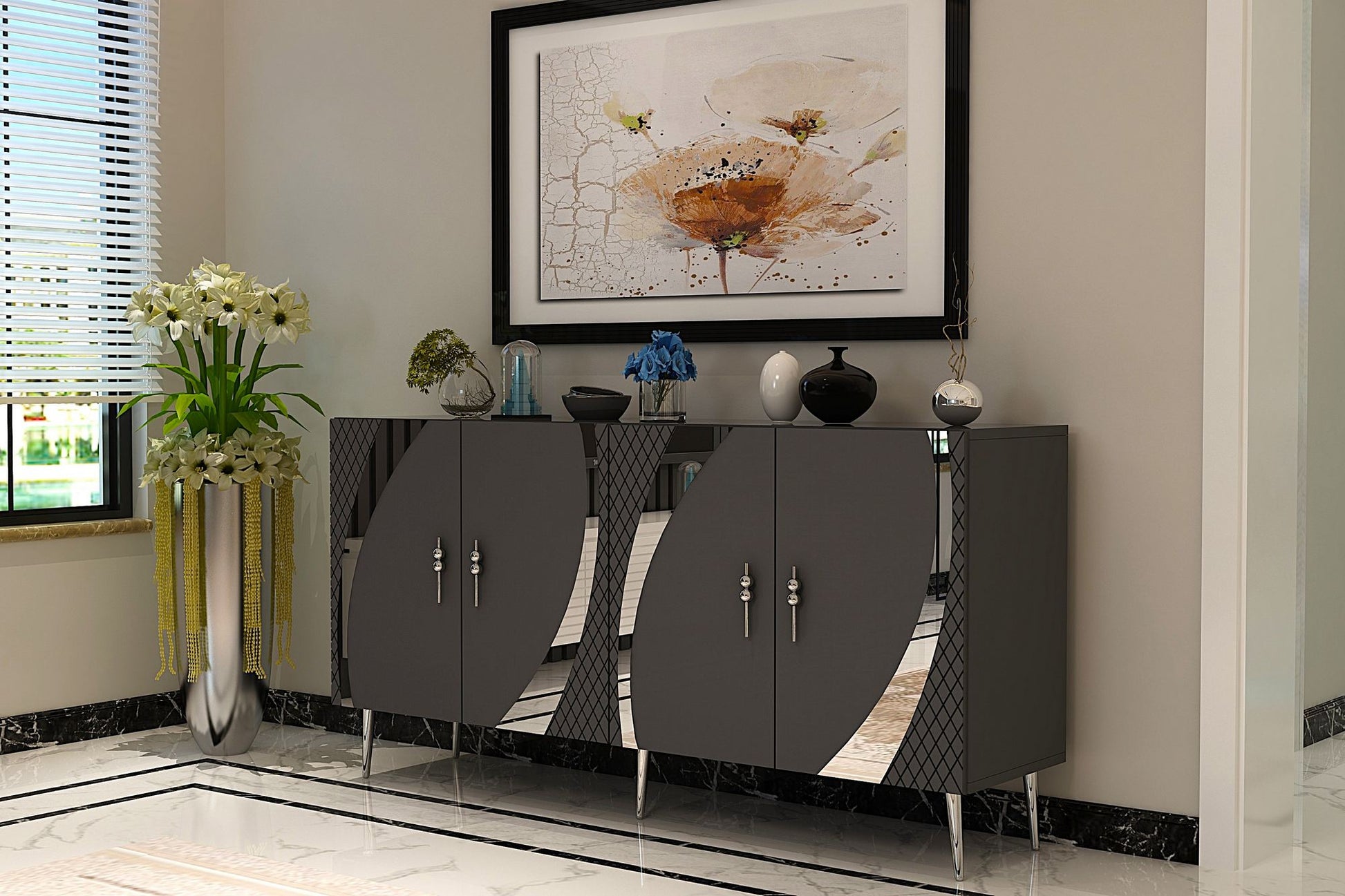 O design elegante desta consola, combinado com as cores antracite e prata, transmite uma sensação de luxo e requinte. Elevará instantaneamente o aspeto da sua sala de estar, do seu corredor ou de qualquer espaço que escolher para a colocar.