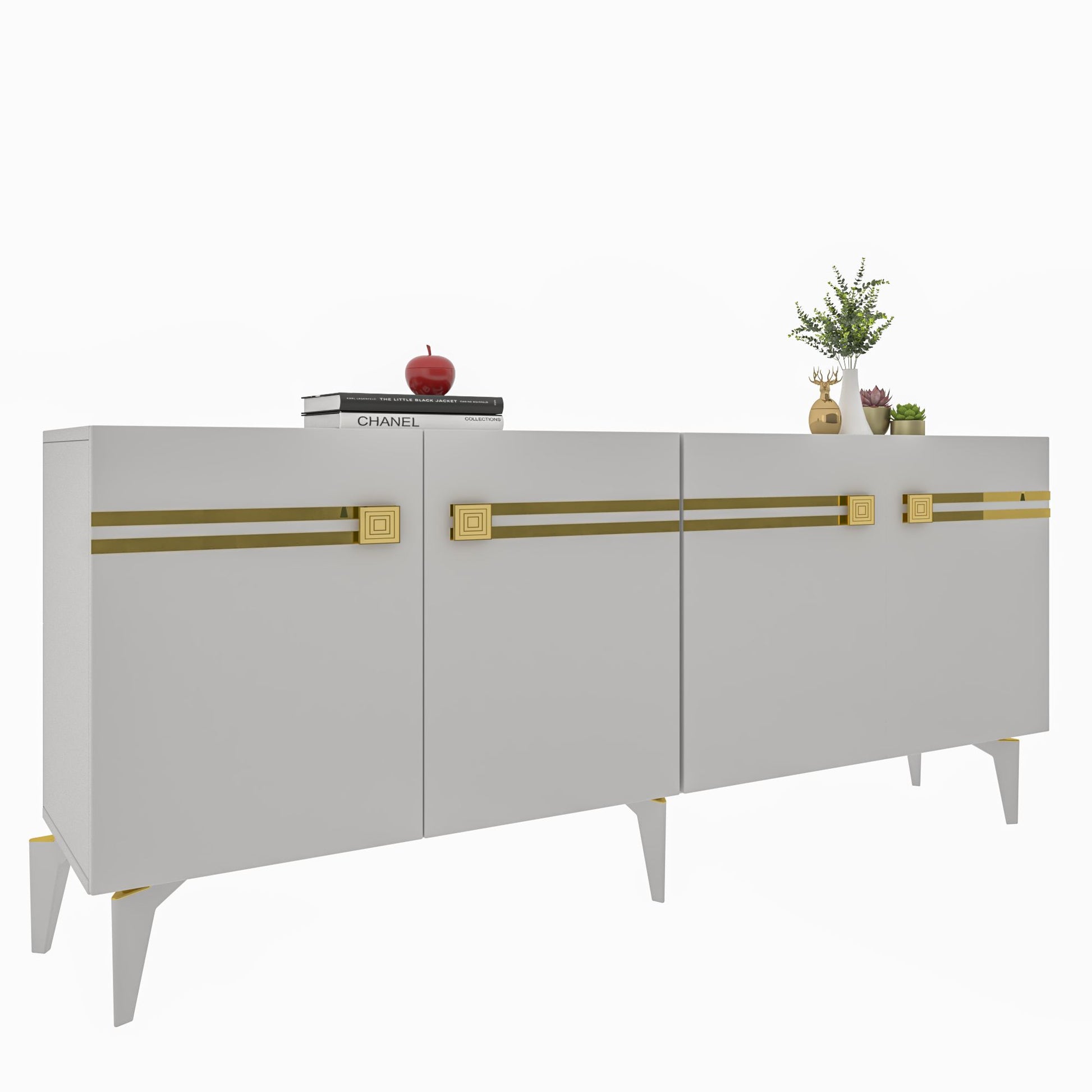 Transforme o seu espaço de vida com a nossa consola deslumbrante, fabricada com painéis de partículas 100% revestidos a melamina. O design elegante e a combinação de cores branca e dourada elevarão instantaneamente o estilo de qualquer divisão.