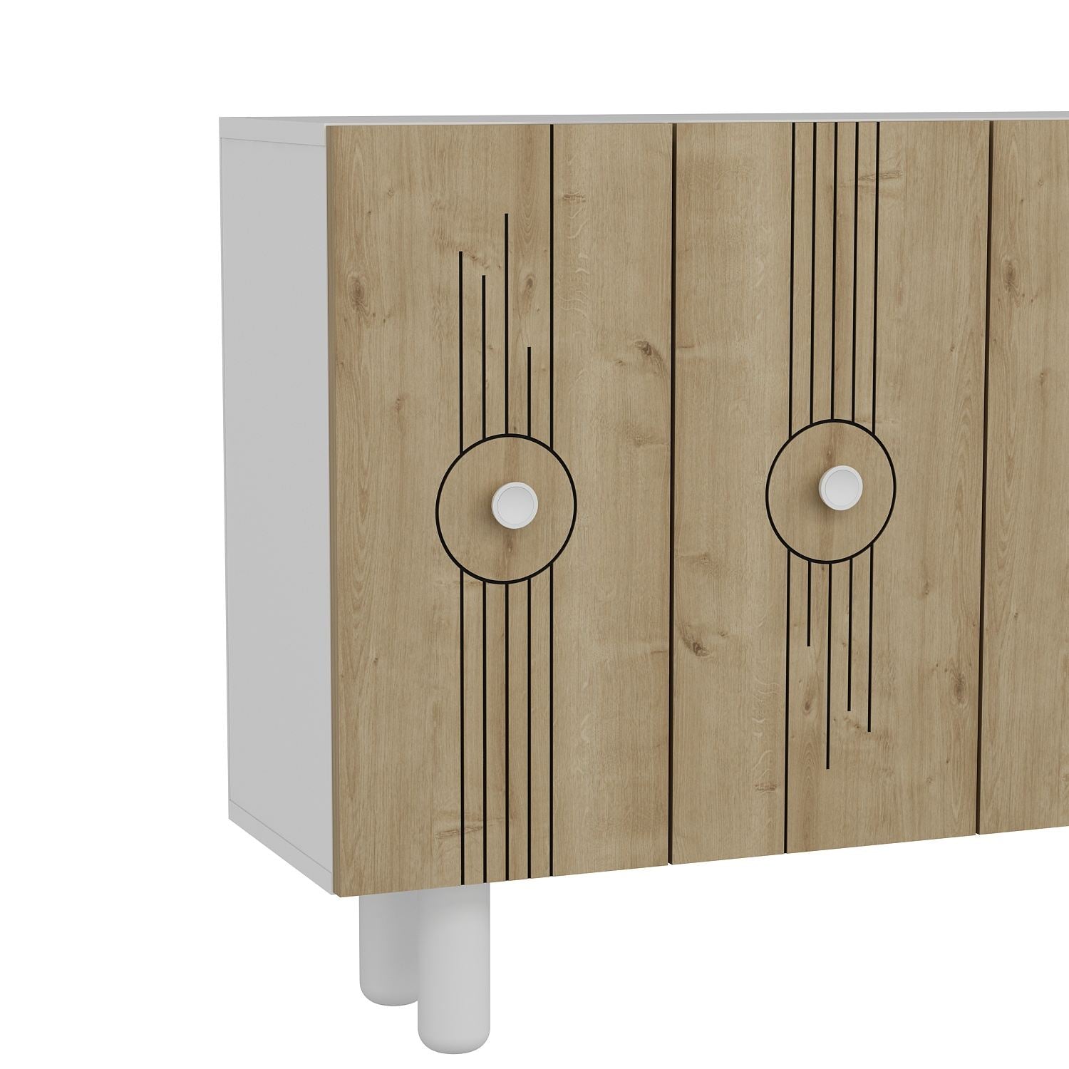 Transforme seu espaço de vida com nosso deslumbrante console, feito de 100% de aglomerado revestido de melamina para durabilidade e estilo. O design elegante e a combinação moderna de cores em branco e carvalho safira elevarão instantaneamente qualquer ambiente da sua casa.