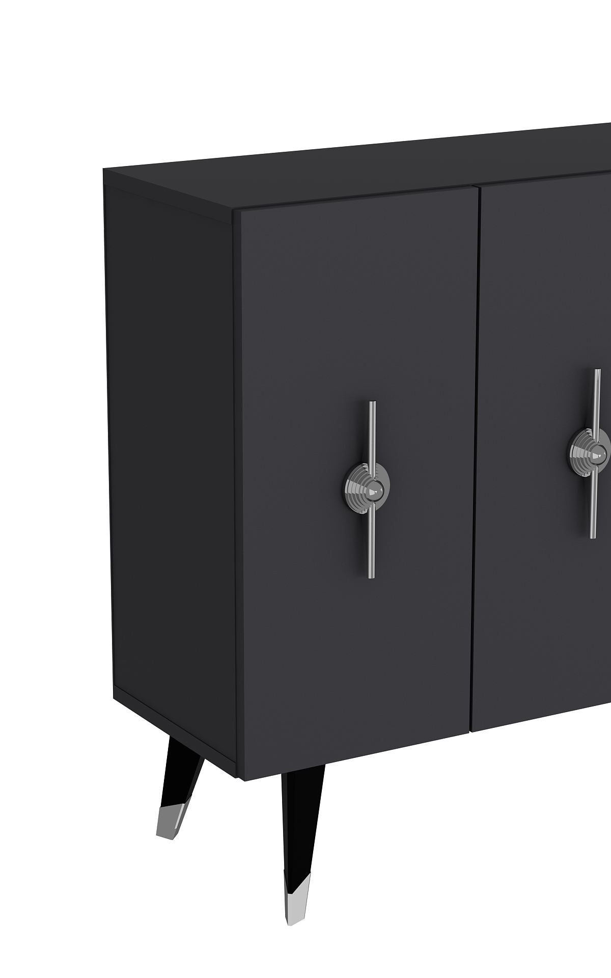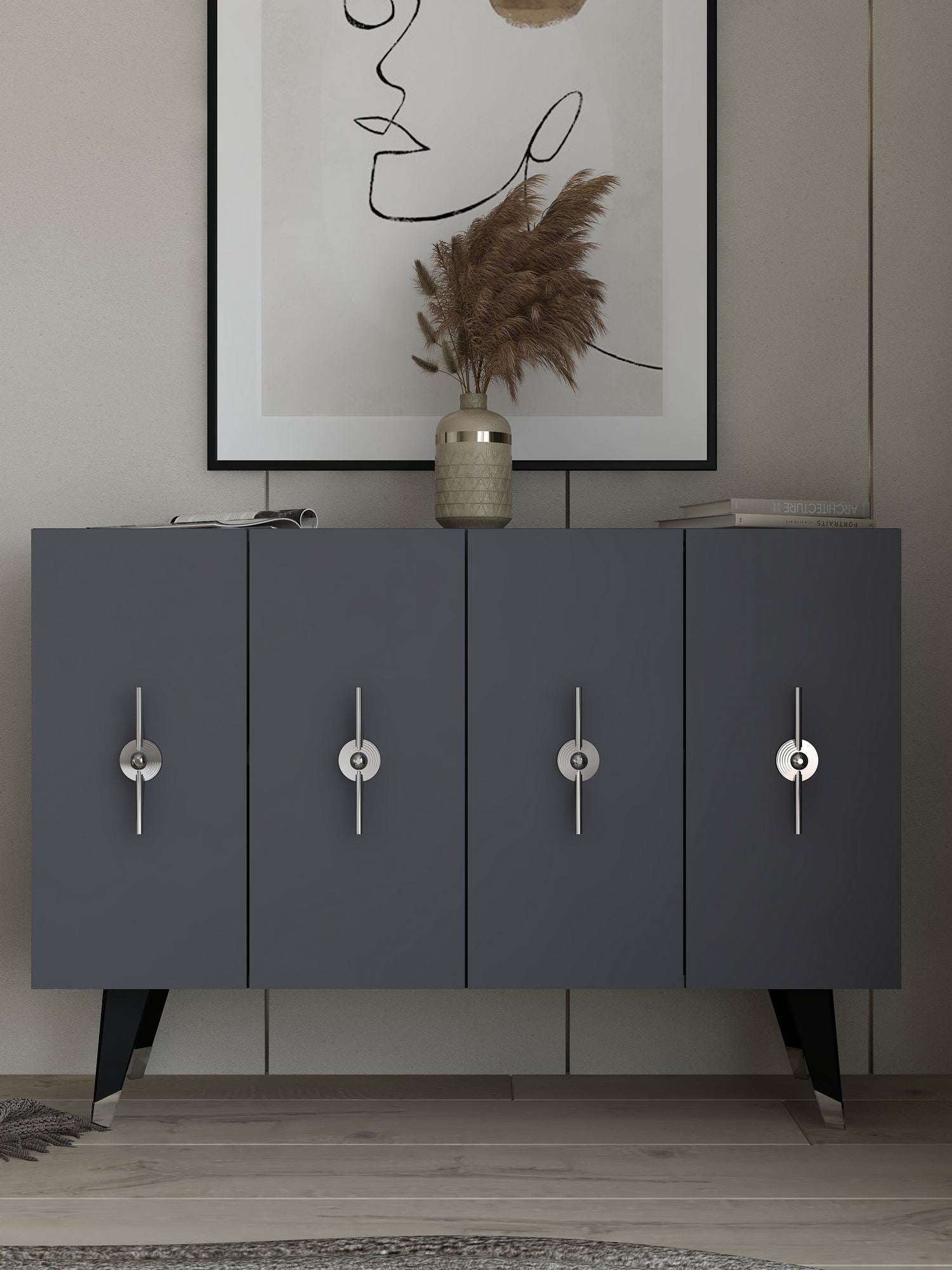 Transforme seu espaço de vida com nosso deslumbrante console, feito de 100% de painel de partículas revestido de melamina. Esta peça elegante e moderna foi projetada para elevar qualquer ambiente com sua combinação de cores prateada e antracite.