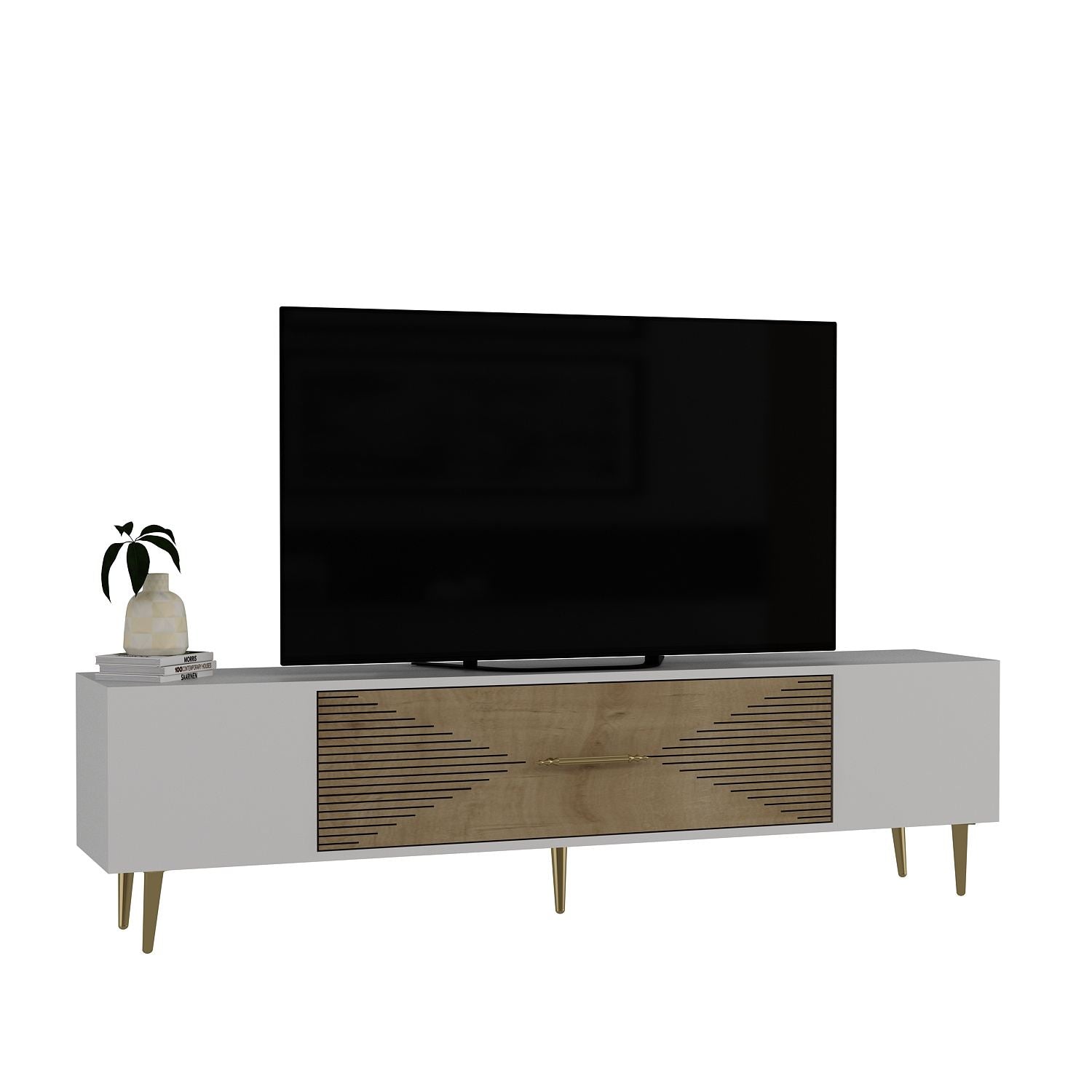 Móvel de TV – 150 cm x 48.2 cm x 29.6 cm – Carvalho Safira, Branco e Dourado – Painéis de partículas revestidos a melamina