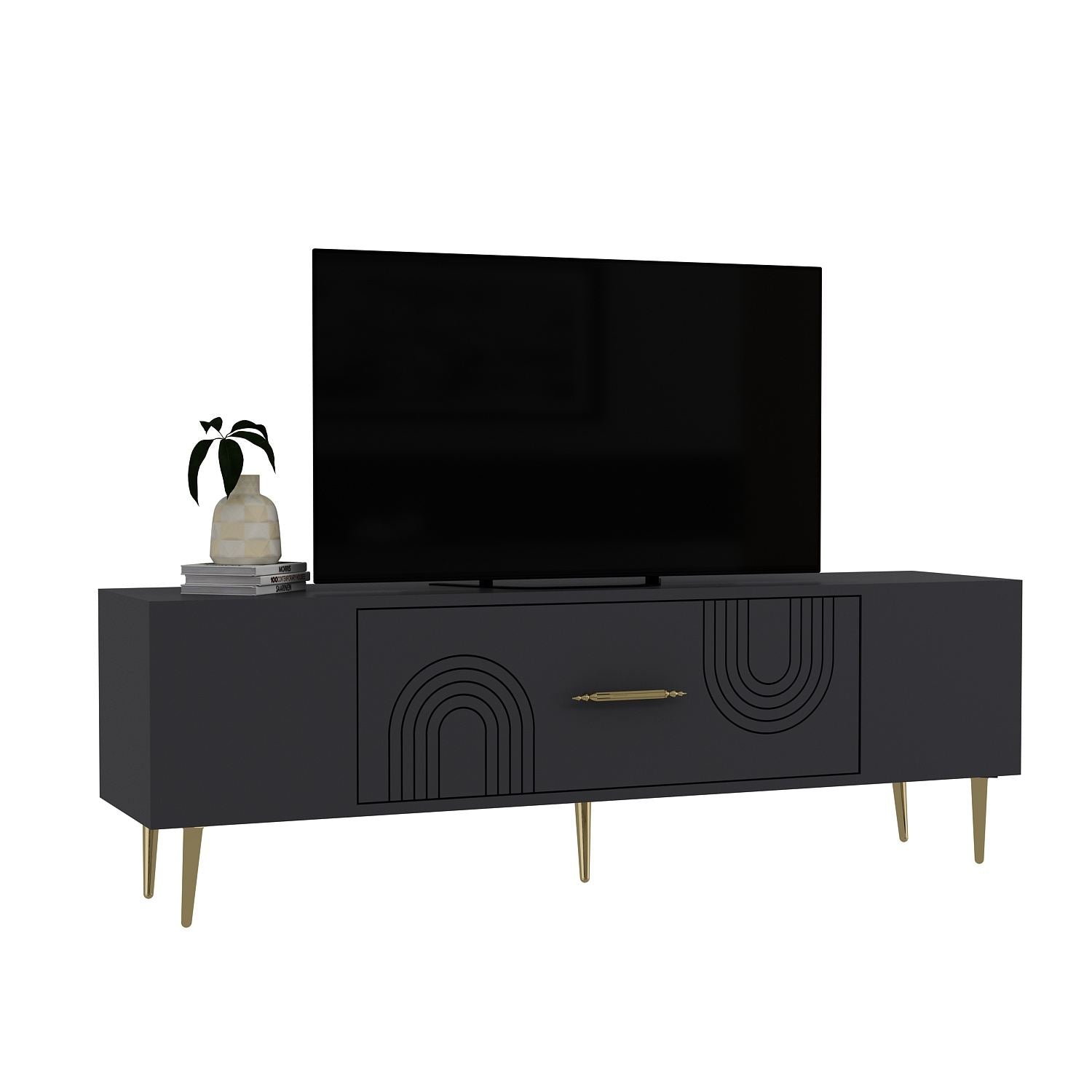 Transforme a sua sala de estar num espaço elegante e sofisticado com o nosso impressionante suporte para televisão. O design elegante e a combinação de cores elegantes de antracite e dourado irão elevar instantaneamente o aspeto da sua área de entretenimento.