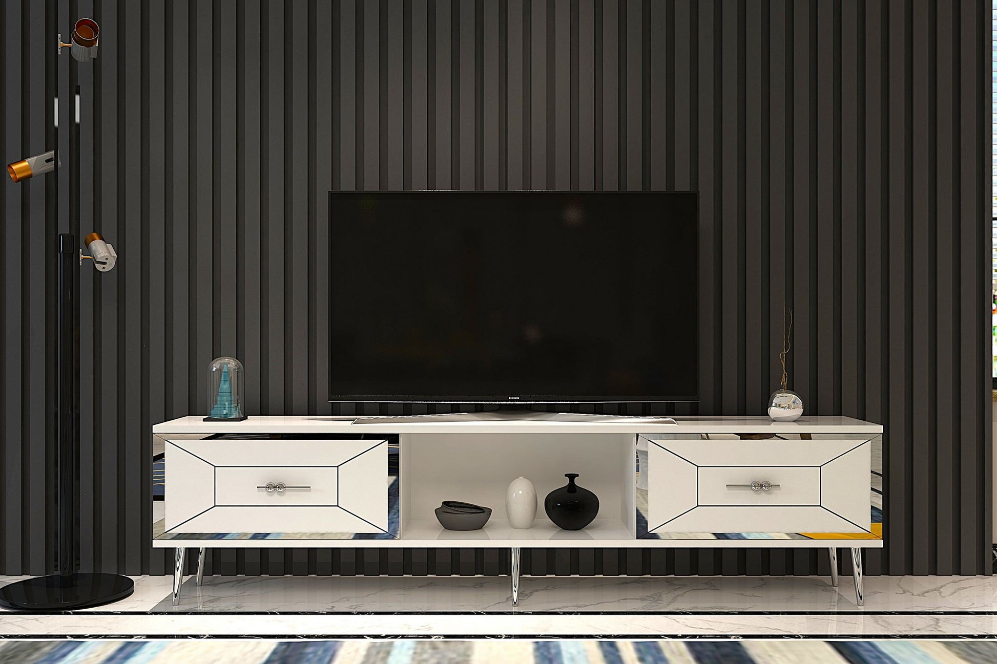 Móvel de TV – 150cm – Branco e Prata – Painel de partículas revestido de melamina