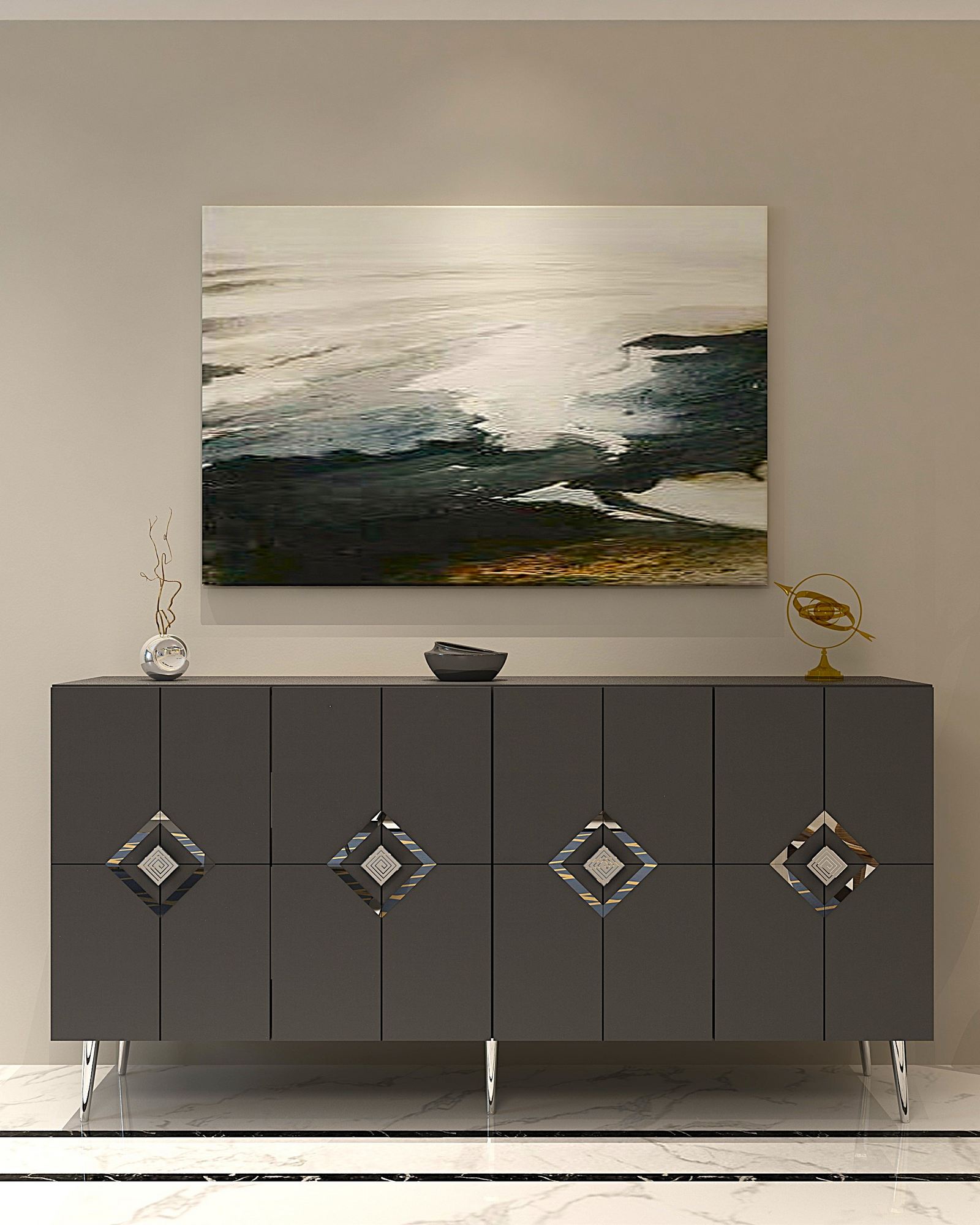 Com seu design elegante e linhas limpas, este console é a adição perfeita para qualquer casa moderna. As cores antracite e prata criam um contraste marcante que fará uma declaração em qualquer cômodo.
