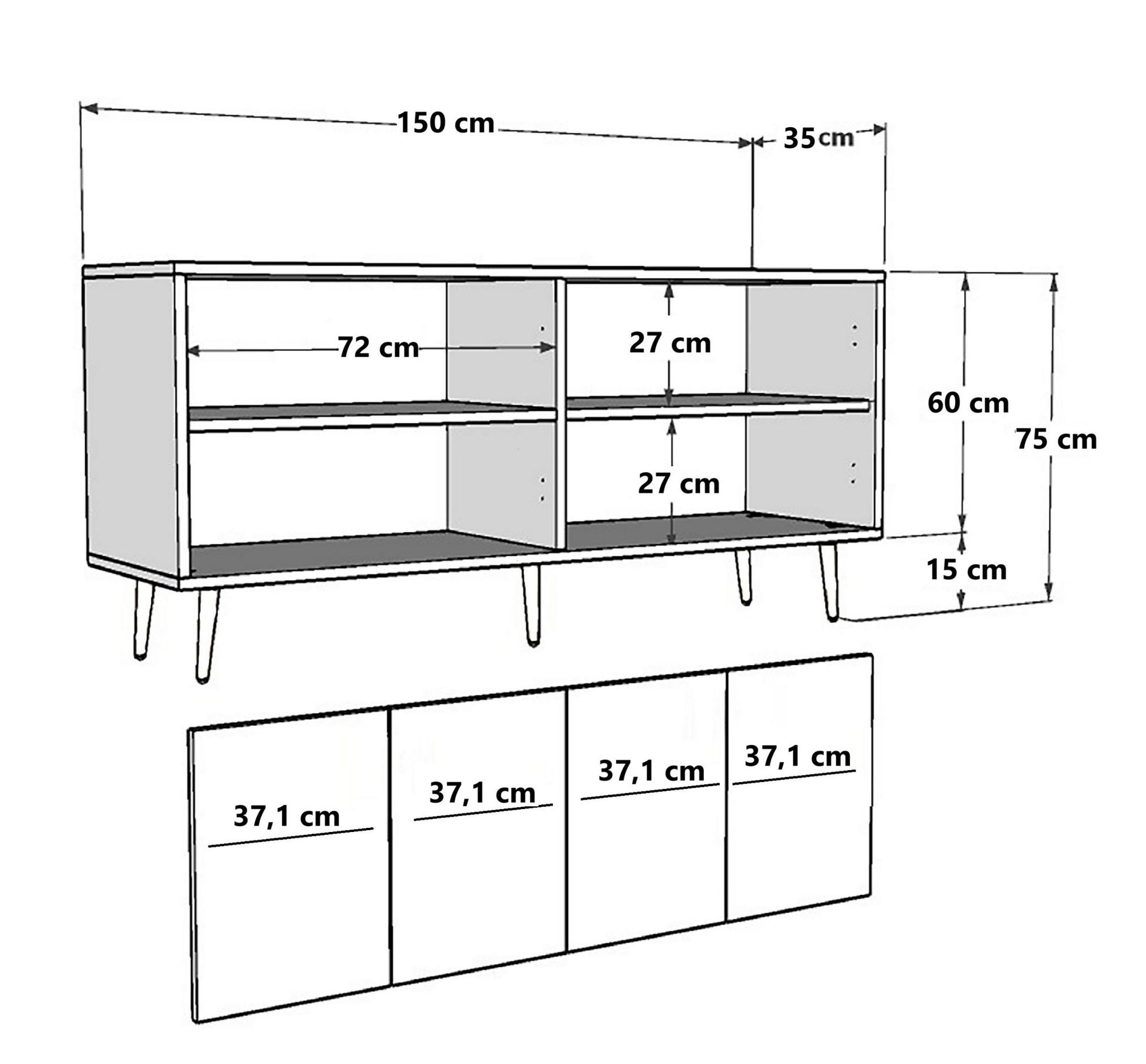O console é feito de 100% de aglomerado revestido de melamina, garantindo durabilidade e longevidade. Com uma espessura de 18mm, este console foi projetado para durar por muitos anos. As dimensões espaçosas de 150cm de largura, 75cm de altura e 35cm de profundidade oferecem amplo espaço de armazenamento para todos os seus itens essenciais. As numerosas prateleiras, com 72cm de largura e 27cm de altura, permitem que você organize e exiba seus pertences com facilidade.