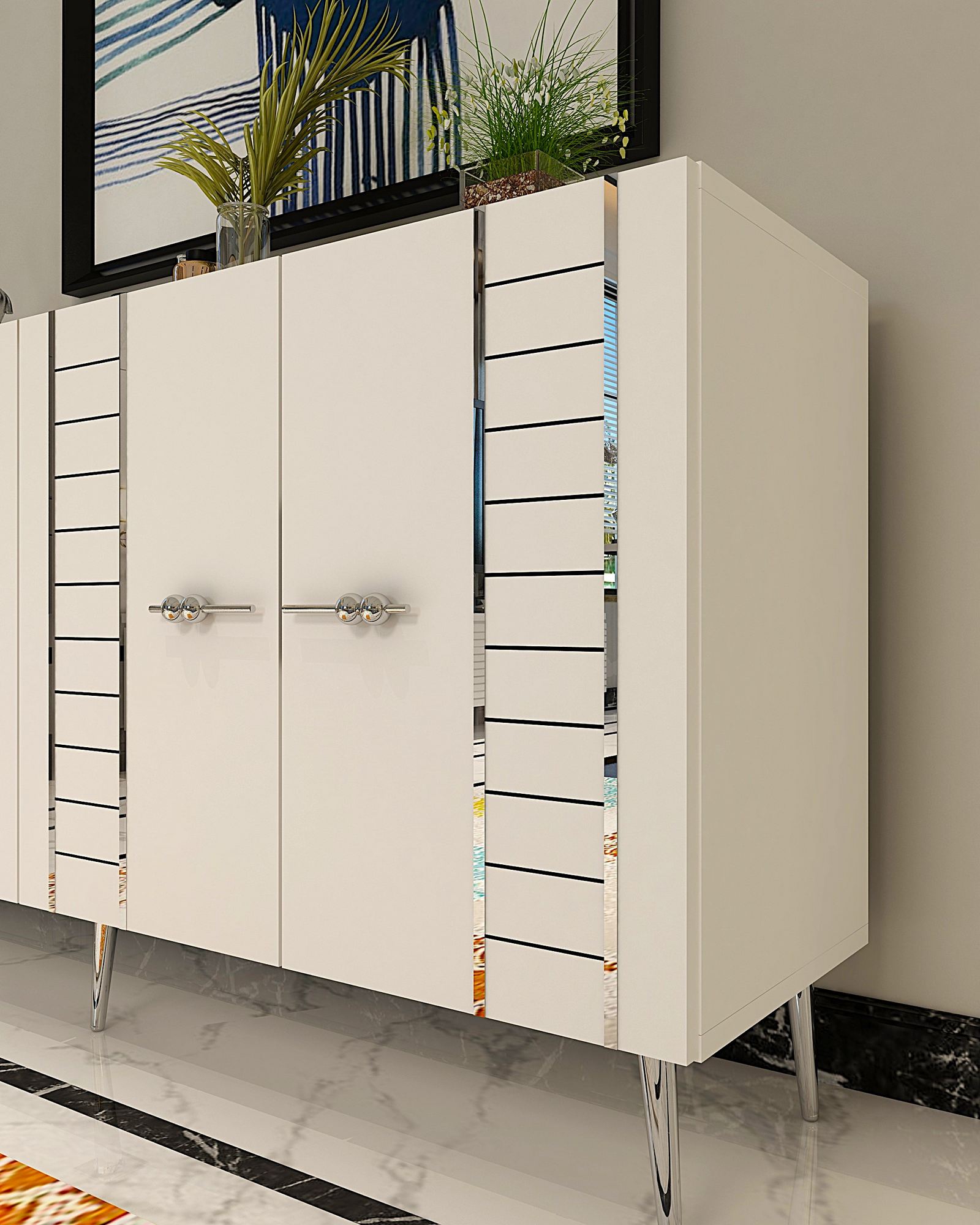 Transforme seu espaço de vida com nosso deslumbrante console, feito de 100% de aglomerado revestido de melamina. Esta peça elegante e moderna foi projetada para elevar qualquer ambiente com sua combinação de cores branca e prata.