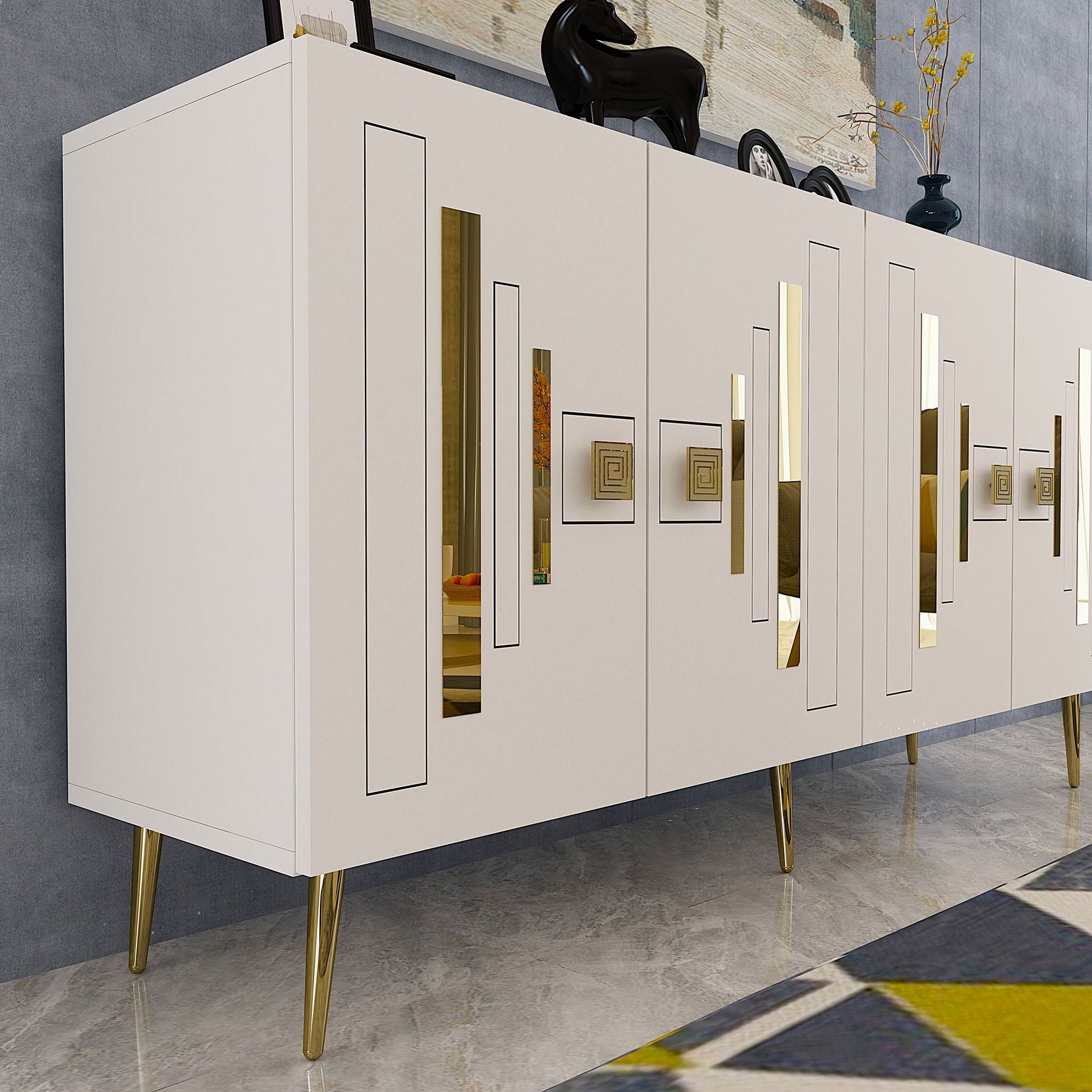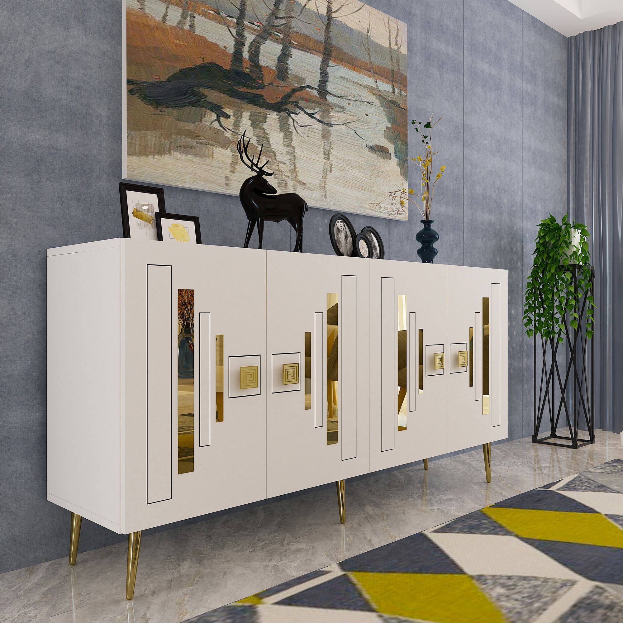 Transforme seu espaço de vida com nosso deslumbrante console, feito de 100% de painel de partículas revestido com melamina. O design elegante e a combinação de cores branca e dourada elevarão instantaneamente o estilo de qualquer ambiente.