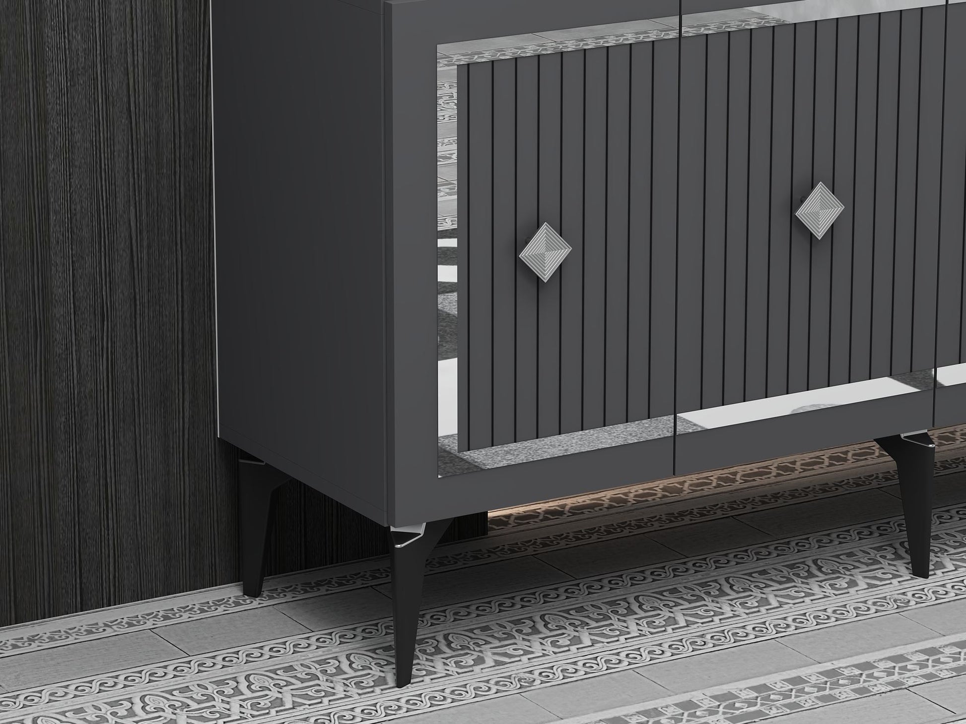 Transforme seu espaço de vida com nosso deslumbrante console, feito de 100% de aglomerado revestido de melamina. Esta peça elegante e moderna foi projetada para elevar qualquer ambiente com sua combinação de cores elegante em Antracite e Prata.