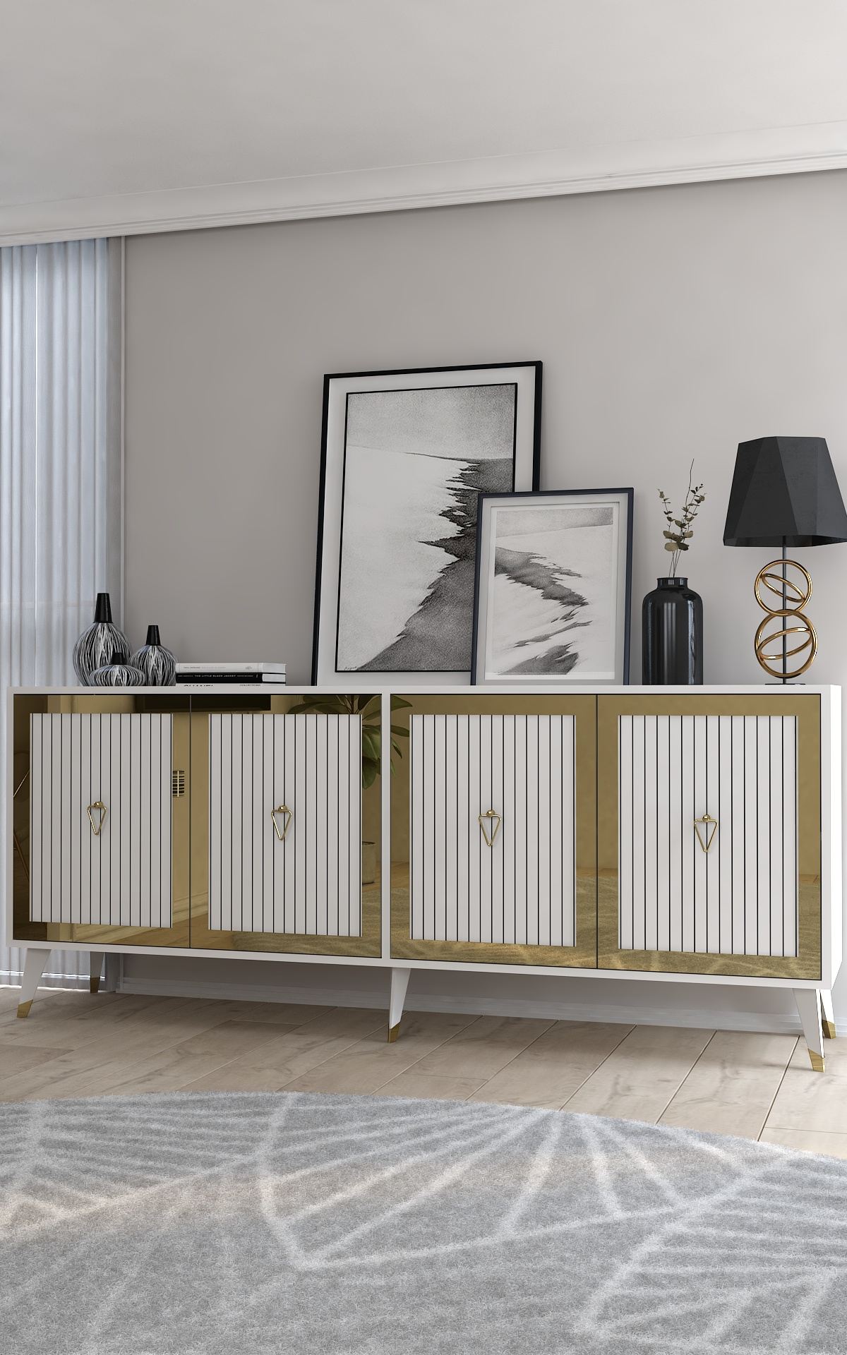 A combinação de branco e dourado confere a este console um visual luxuoso e glamouroso que impressionará seus convidados e deixará uma impressão duradoura. As linhas limpas e o design minimalista adicionam um toque de modernidade ao seu espaço.