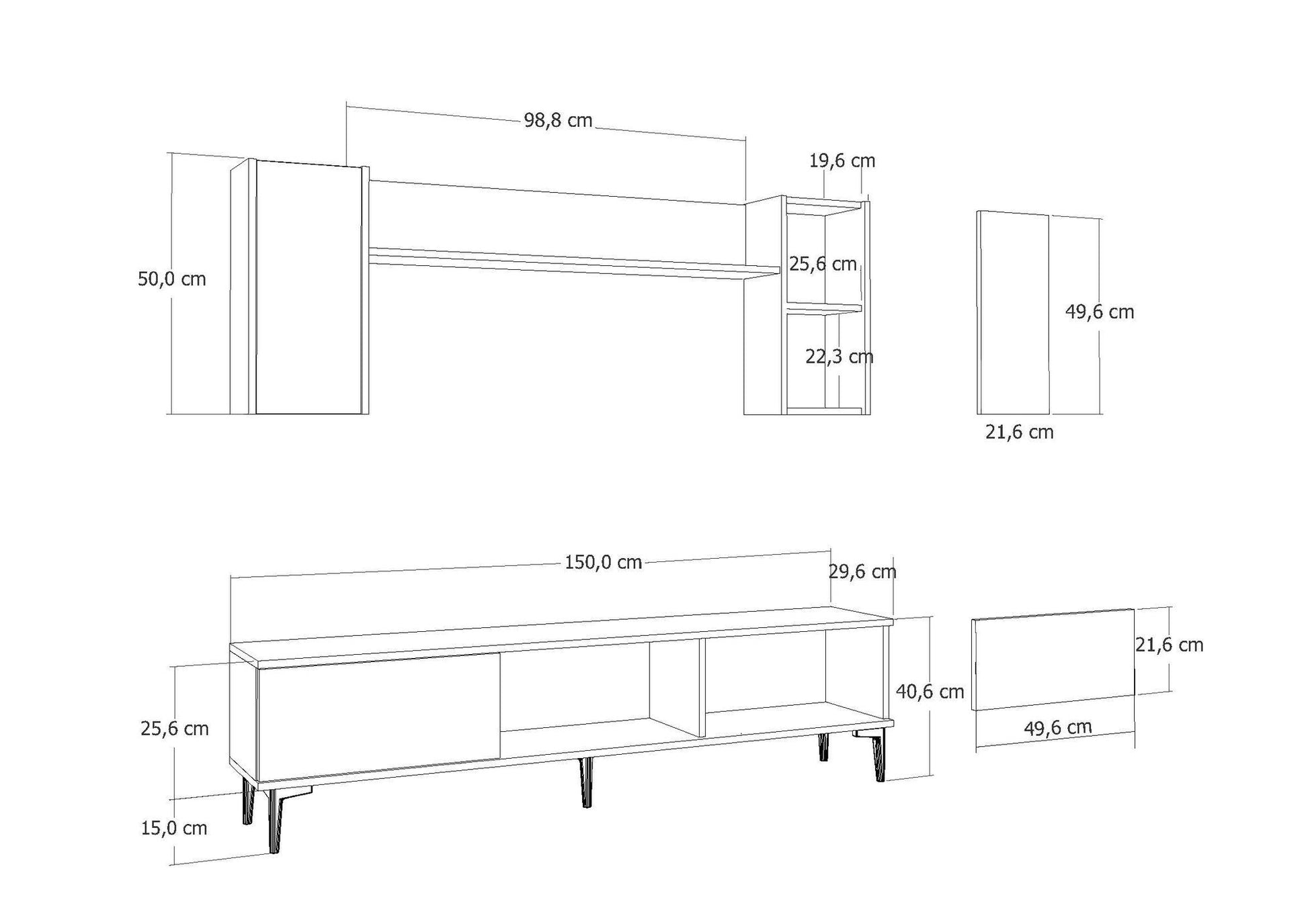 - Dimensões da Prateleira de Parede: Largura: 150 cm, Altura: 49,6 cm, Profundidade: 19,6 cm