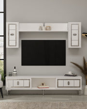 Com uma combinação de cores branca e prata, esta unidade de TV elevará instantaneamente o visual da sua sala de estar. As linhas limpas e o design minimalista a tornam uma adição perfeita para qualquer casa moderna.
