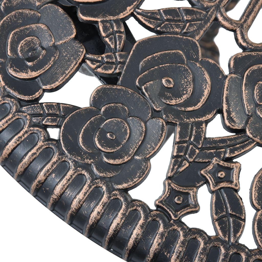 A mesa e cadeiras de exterior são feitos de alumínio fundido resistente, que é resistente às intempéries e altamente durável. Os pés de ferro fundido adicionam robustez ao conjunto. O padrão floral detalhado dará a qualquer jardim, pátio ou varanda um toque romântico.