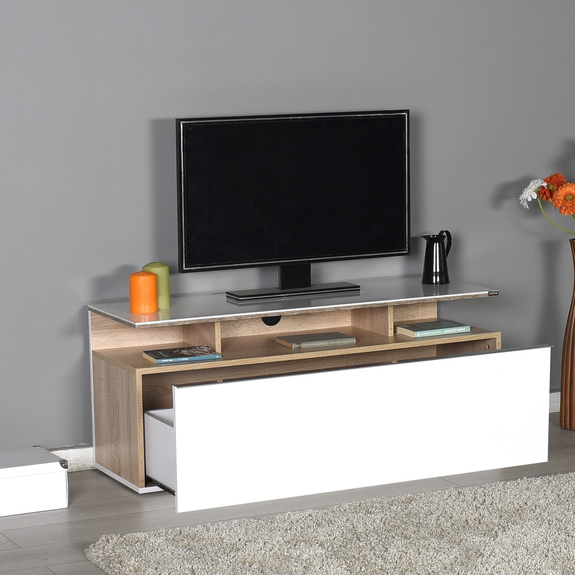 Transforme sua sala de estar em um espaço elegante e organizado com nosso suporte para TV moderno. Feito de 100% de MDF revestido de melamina, este suporte para TV não é apenas durável, mas também incrivelmente chique. A combinação das cores Carvalho e Branco adiciona um toque moderno a qualquer ambiente, enquanto as numerosas prateleiras oferecem amplo espaço de armazenamento para todos os seus itens essenciais de entretenimento.