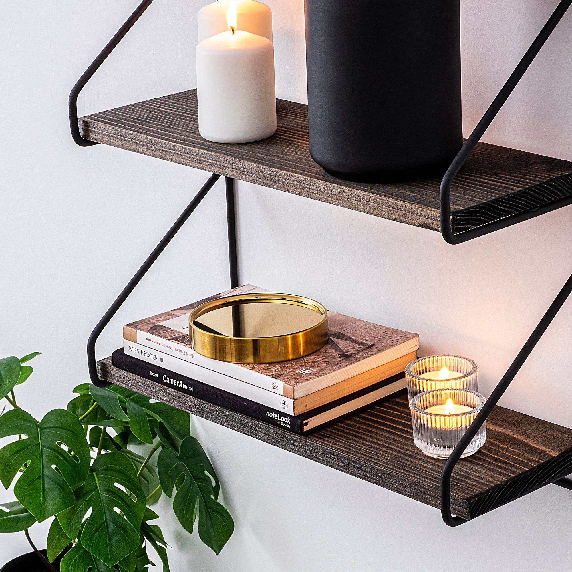 A madeira de abeto com 15 mm de espessura e a estrutura metálica com 6 mm de espessura garantem que esta prateleira de parede não é apenas esteticamente agradável, mas também resistente e duradoura. Cada prateleira tem uma capacidade de carga de 1,3 kg, enquanto a prateleira total pode suportar até 4 kg, o que a torna perfeita para expor os seus objectos mais queridos.