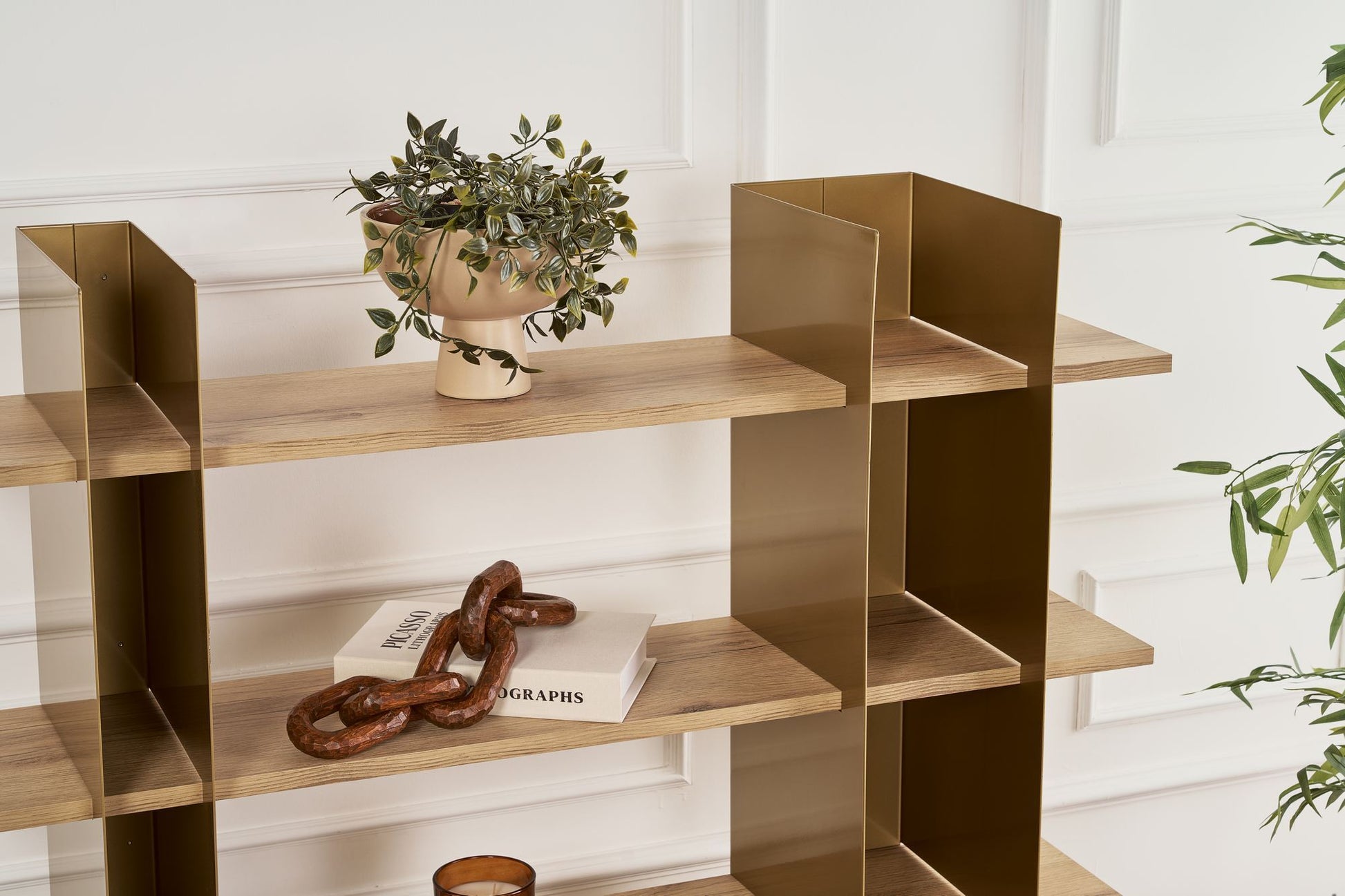 Faça uma declaração com esta estante chamativa que instantaneamente elevará o visual de qualquer ambiente. A luxuosa cor dourada adiciona um toque de glamour, tornando-a um ponto focal na sua sala de estar, quarto ou escritório em casa. Exiba seus livros favoritos, fotos e peças decorativas com estilo.