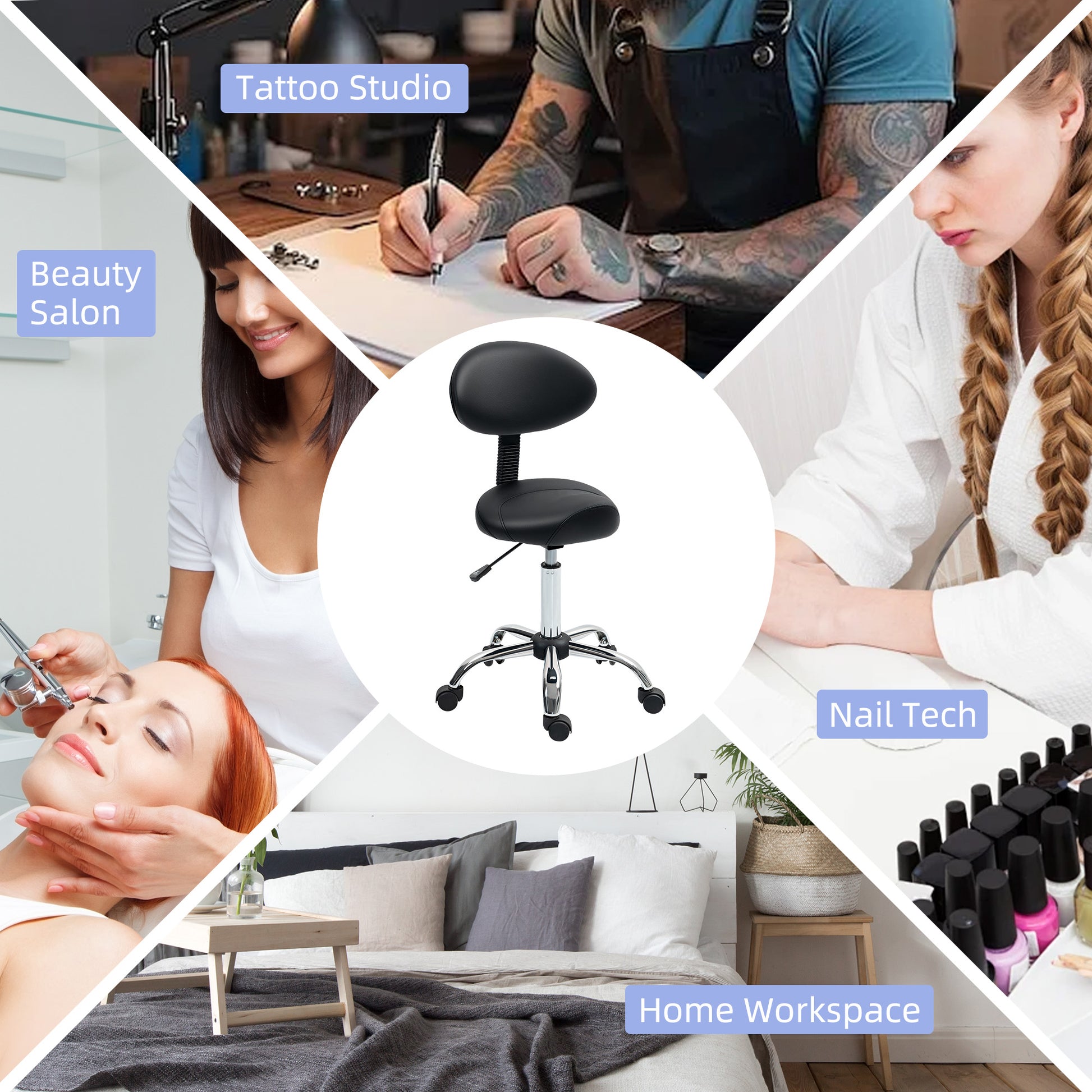 Este banco giratório com rodas e encosto amovível é o parceiro perfeito para longas sessões de trabalho, seja como cadeira de toucador, mesa de maquilhagem ou em qualquer espaço onde o conforto é essencial.