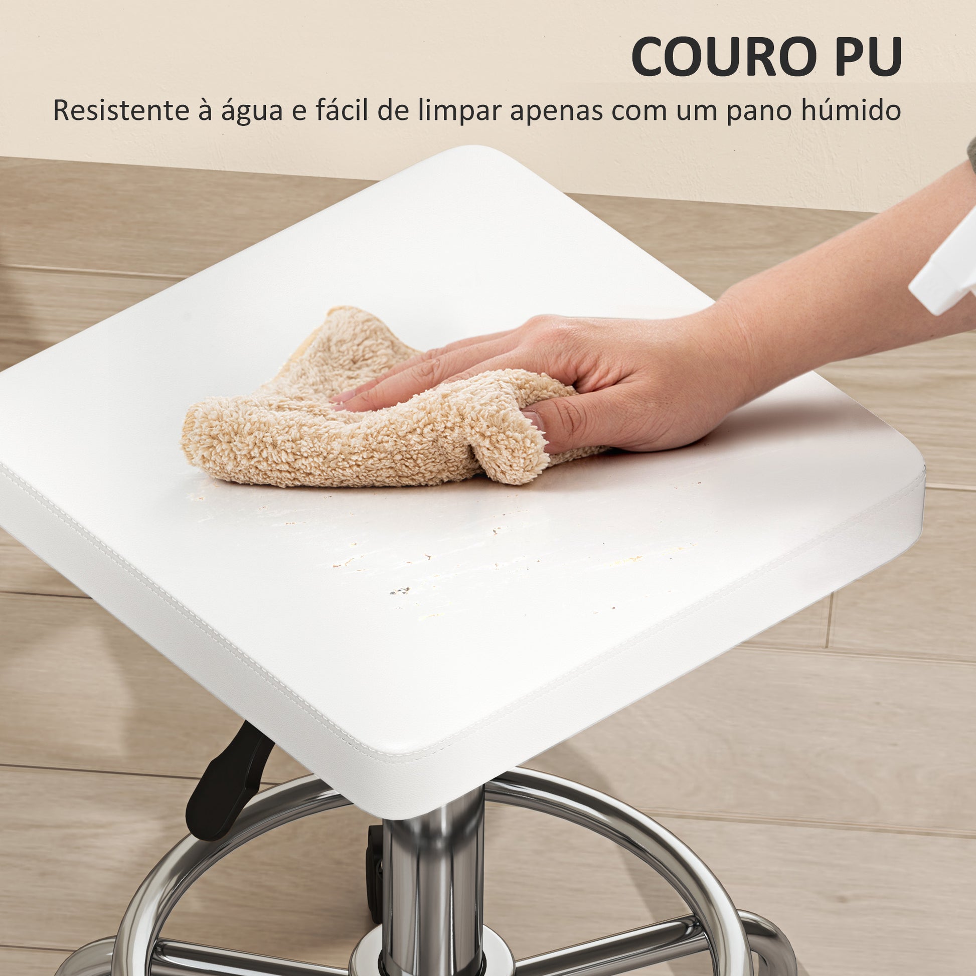 - Benefícios: Assento acolchoado em espuma, altura ajustável, movimento suave com cinco rodas universais, superfície fácil de limpar em PU resistente à água