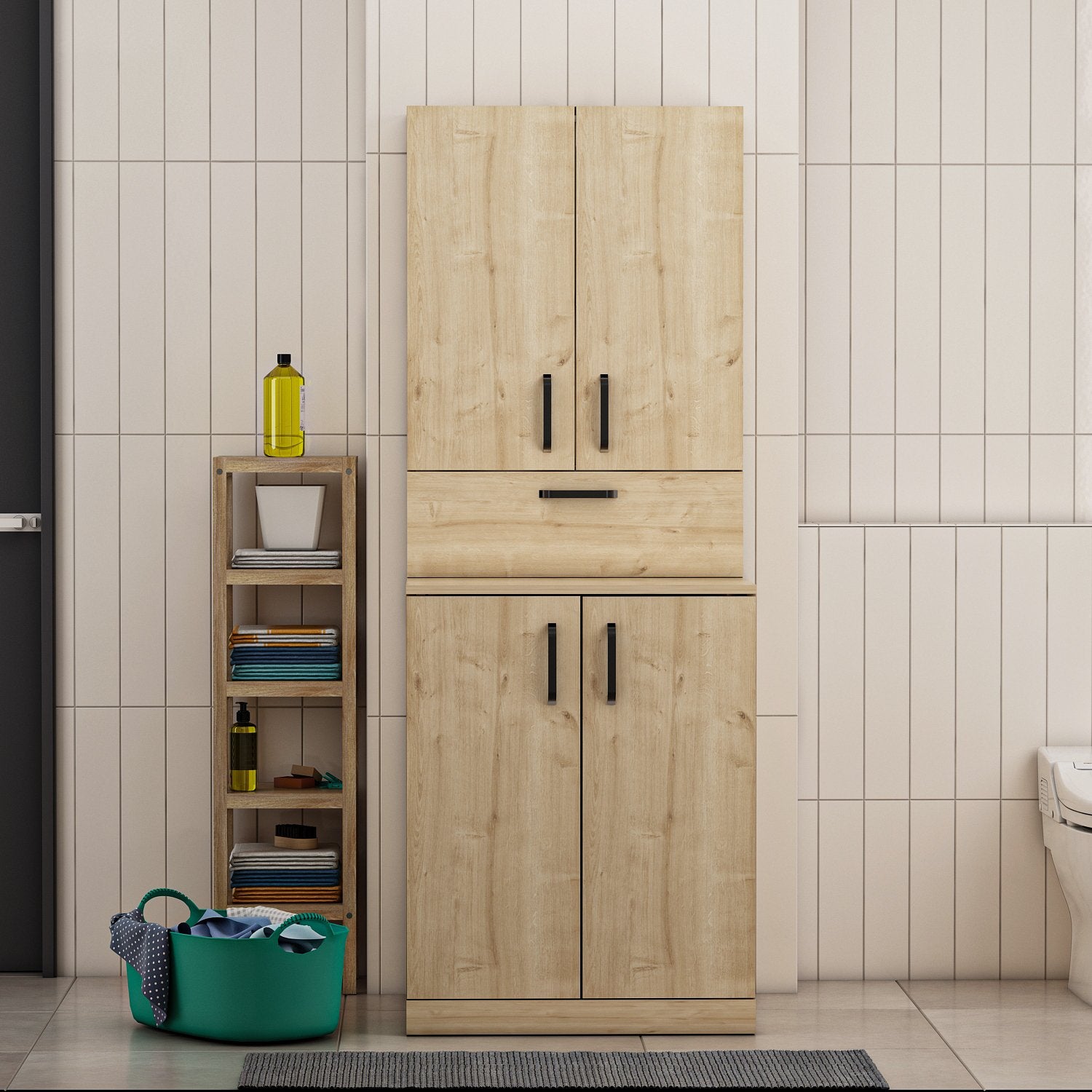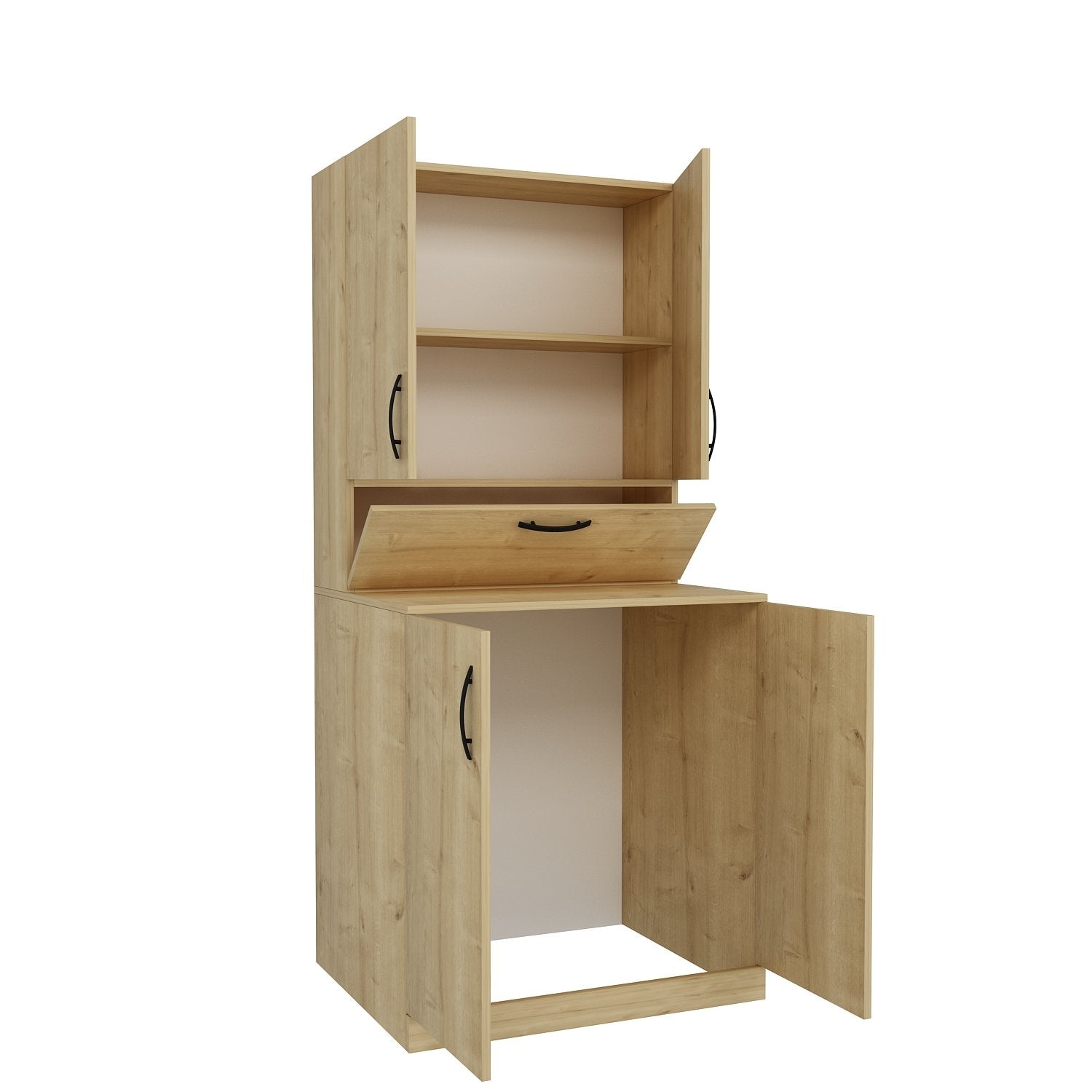 A cor carvalho deste armário adiciona um toque de sofisticação à sua lavanderia, enquanto o conceito de cor sólida garante um visual coeso. O armário pode ser facilmente fixado à parede para maior estabilidade, tornando-se uma solução de armazenamento segura e confiável para sua máquina de lavar.