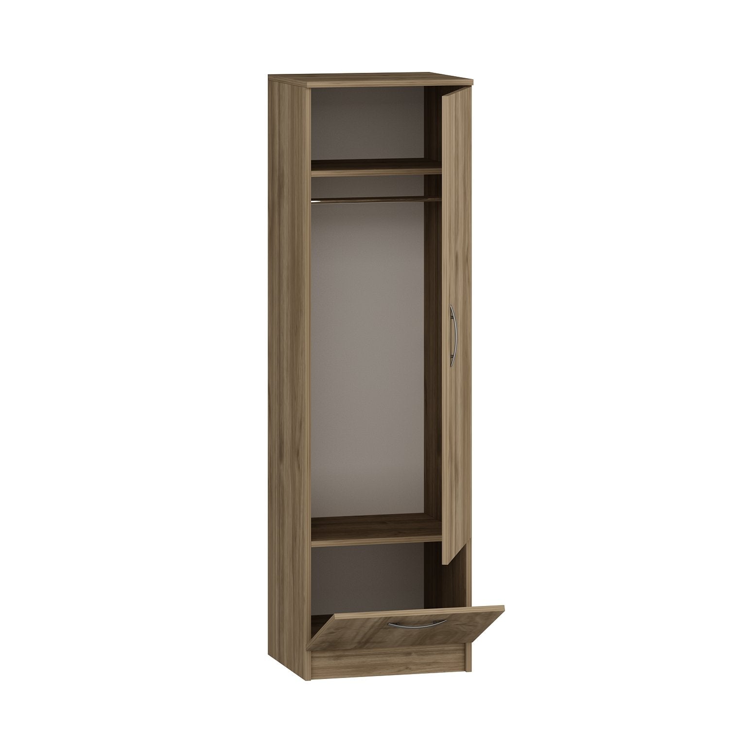A rica cor de nogueira deste roupeiro dá um toque de sofisticação a qualquer divisão. O seu conceito de cor sólida exala elegância e cria uma mistura perfeita com a decoração existente.