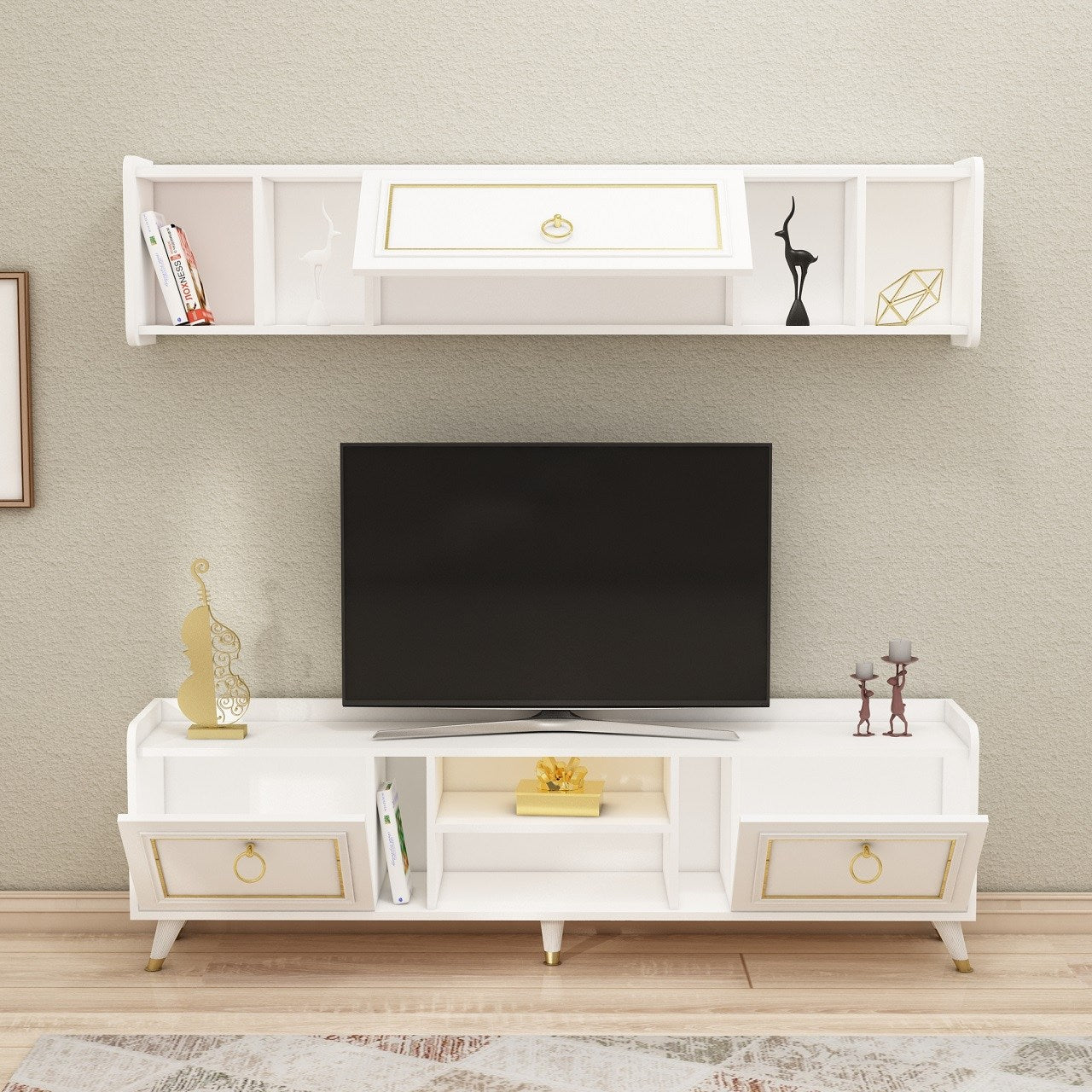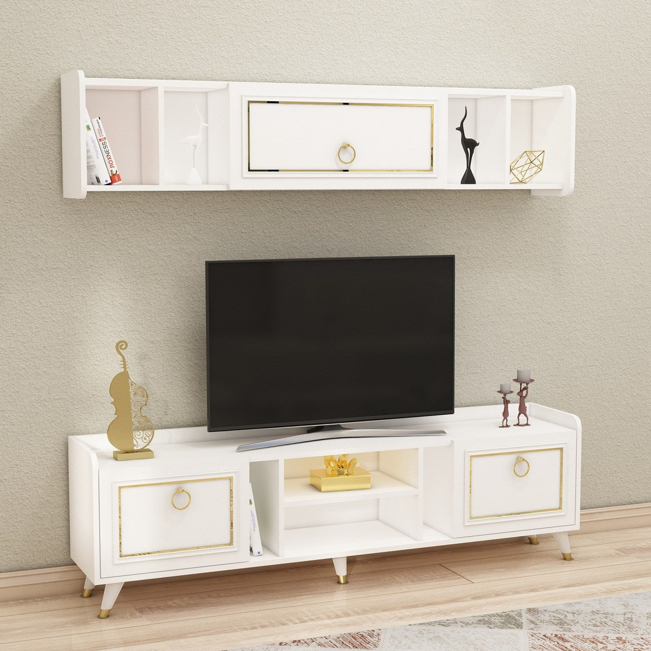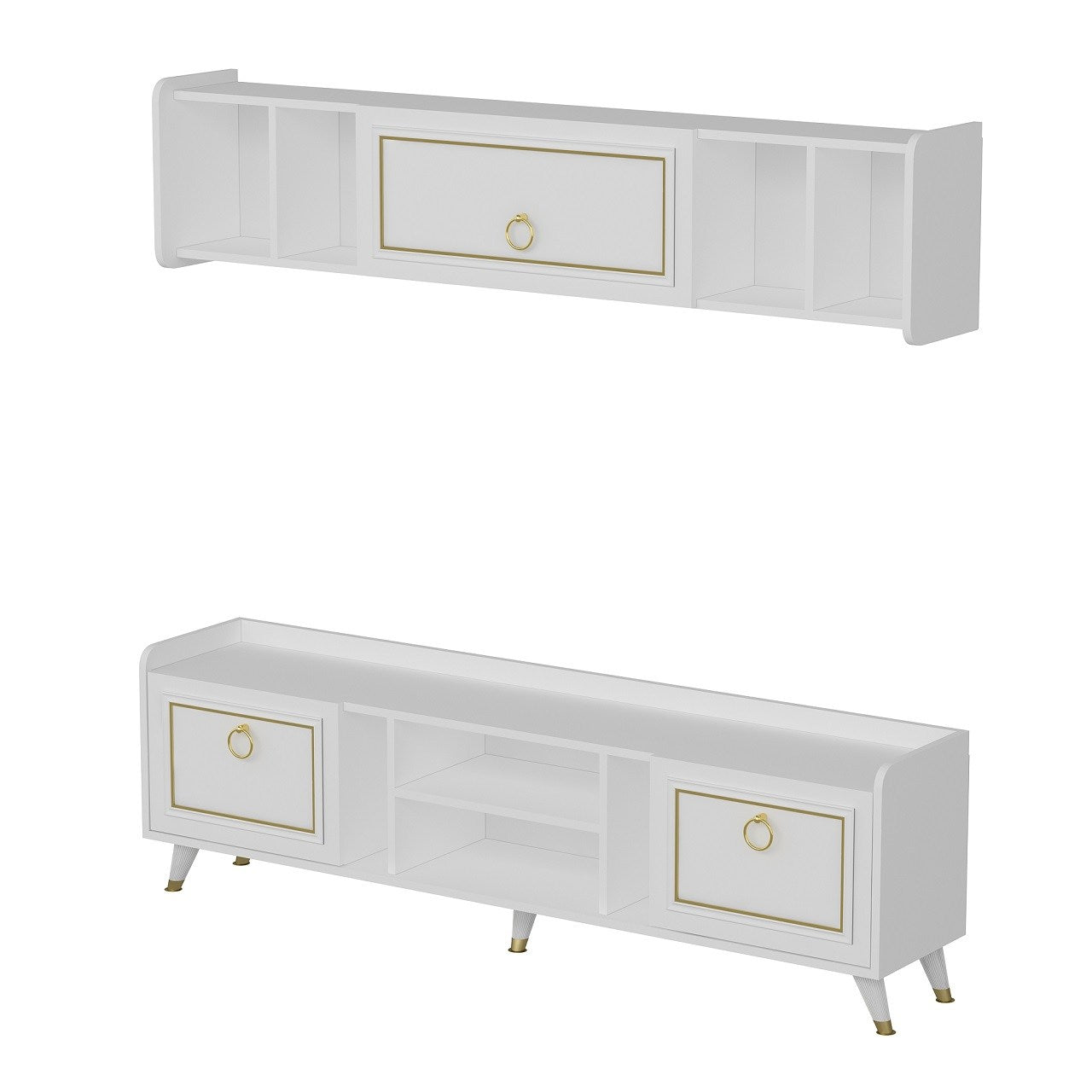 A unidade de TV foi meticulosamente concebida com uma combinação de cores branca e dourada, criando um aspeto intemporal e sofisticado que complementa sem esforço qualquer decoração interior. Quer o seu estilo seja contemporâneo, moderno ou tradicional, este móvel de TV integra-se perfeitamente e melhora a estética geral do seu espaço de vida.