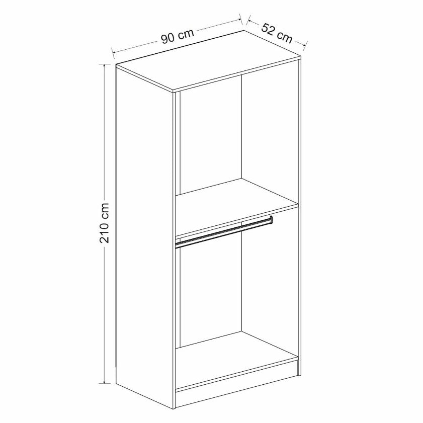 Com uma largura de 90 cm, altura de 210 cm e profundidade de 52 cm, este roupeiro oferece um espaço de arrumação generoso para acomodar todas as suas roupas e acessórios. Diga adeus à desarrumação e desfrute de um quarto bem organizado e arrumado.