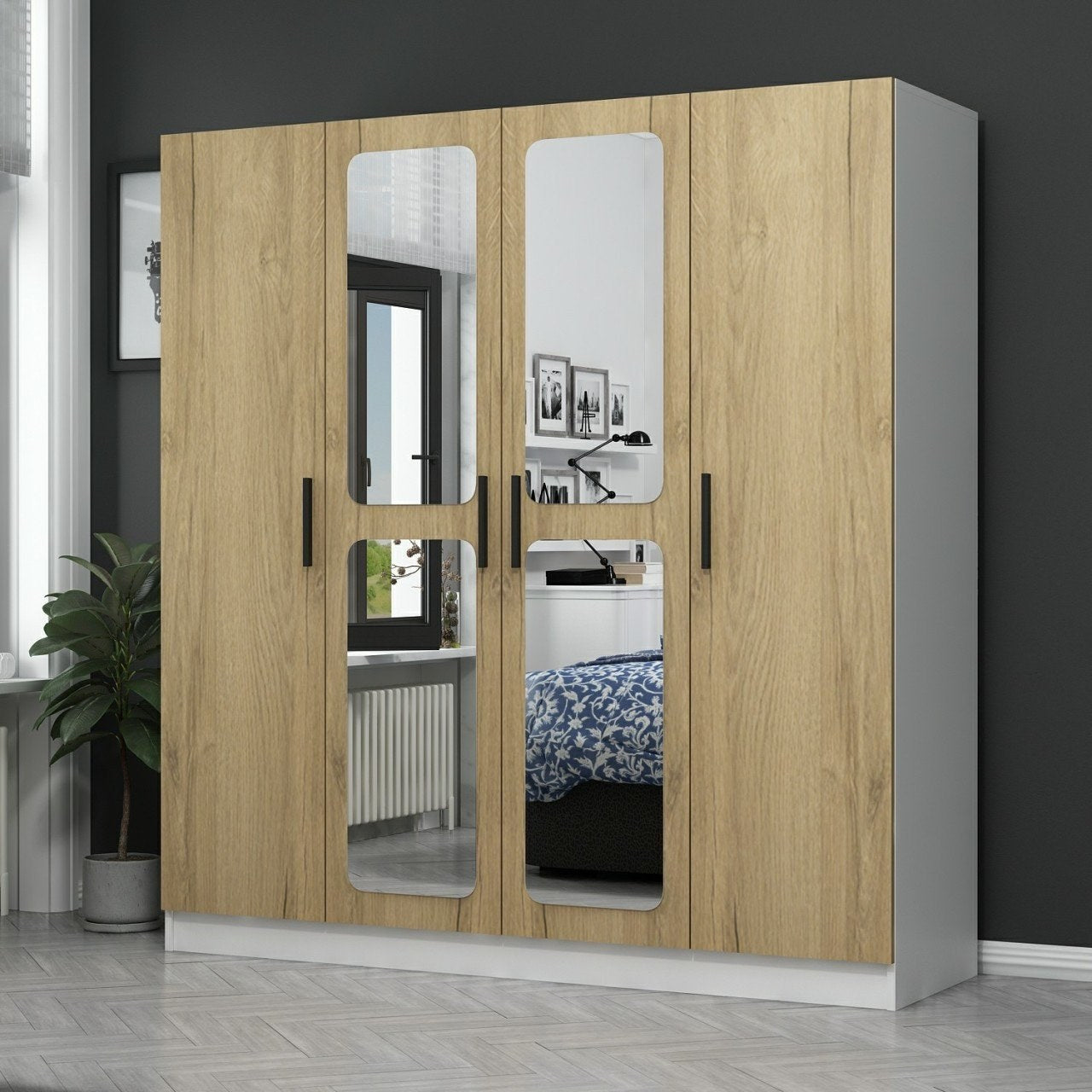Imagine entrar no seu quarto e ser recebido por um roupeiro bem organizado. O nosso roupeiro em nogueira e branco ajudá-lo-á a conseguir isso mesmo. O seu design elegante e o interior espaçoso transformarão o seu quarto num refúgio sereno, promovendo uma sensação de calma e ordem.