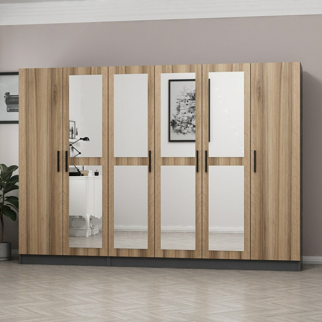 Feito de 100% de MDF revestido de melamina, este armário é construído para durar. A espessura de 18mm garante durabilidade e estabilidade, enquanto as numerosas prateleiras oferecem muito espaço para todas as suas roupas, sapatos e acessórios. A largura de 270cm, altura de 210cm e profundidade de 52cm oferecem amplo espaço de armazenamento sem ocupar muito espaço no seu quarto.