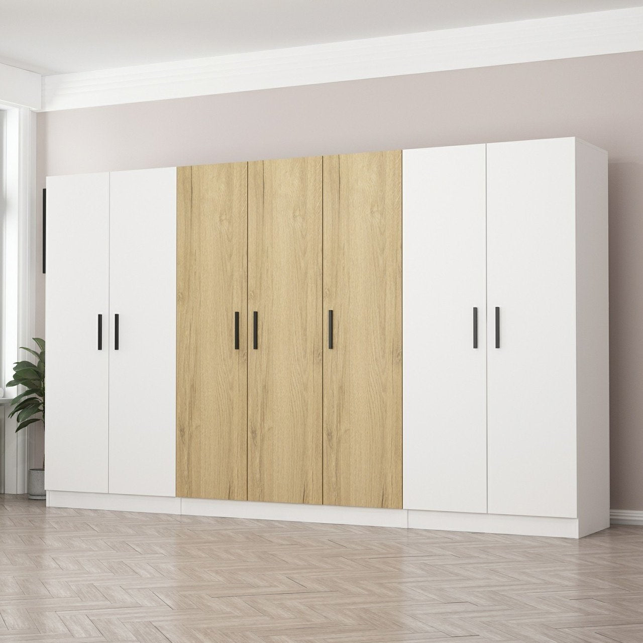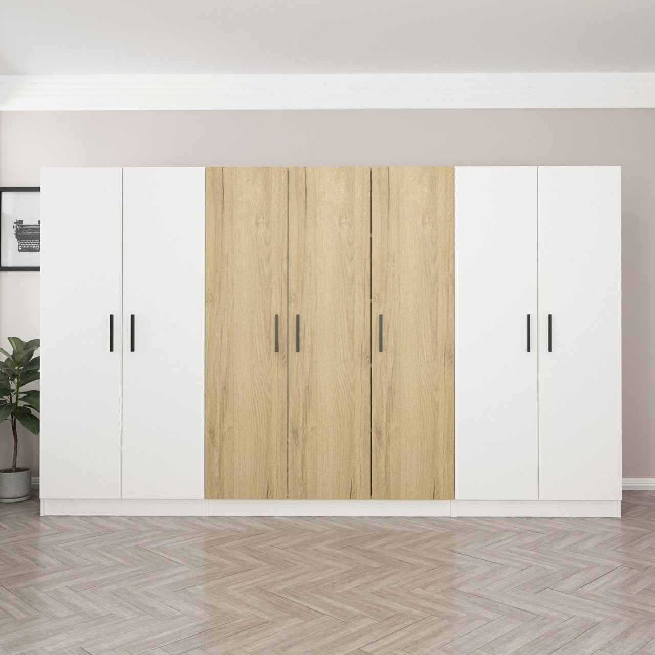 Com as suas dimensões generosas de 315 cm de largura, 190 cm de altura e 52 cm de profundidade, este roupeiro oferece muito espaço para organizar as suas roupas, acessórios e muito mais. As numerosas prateleiras proporcionam opções de arrumação práticas, permitindo-lhe manter tudo bem arrumado e facilmente acessível.