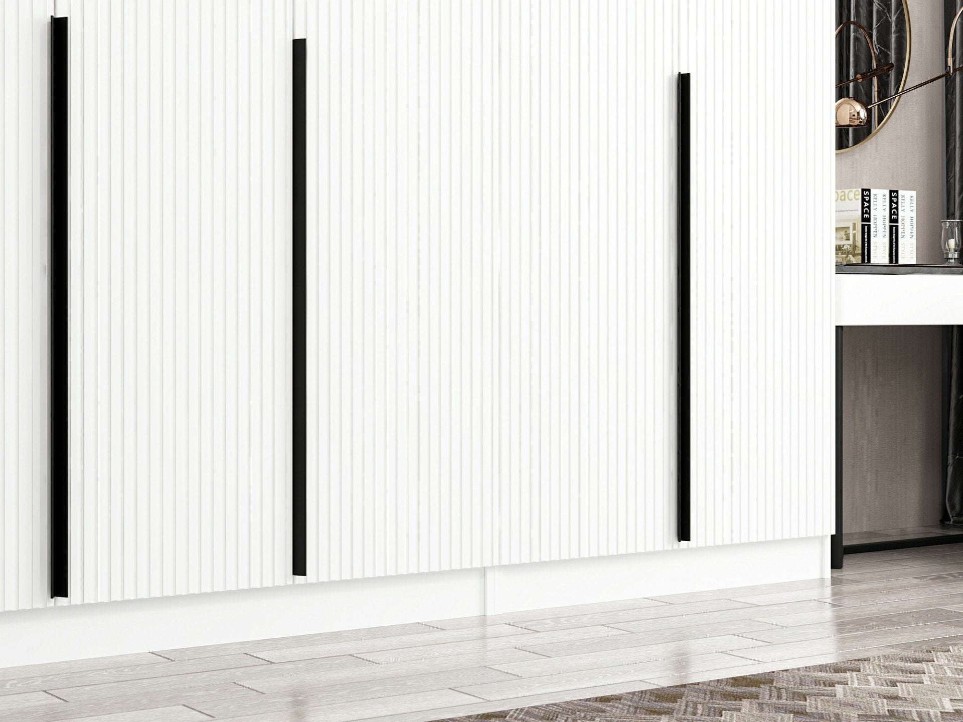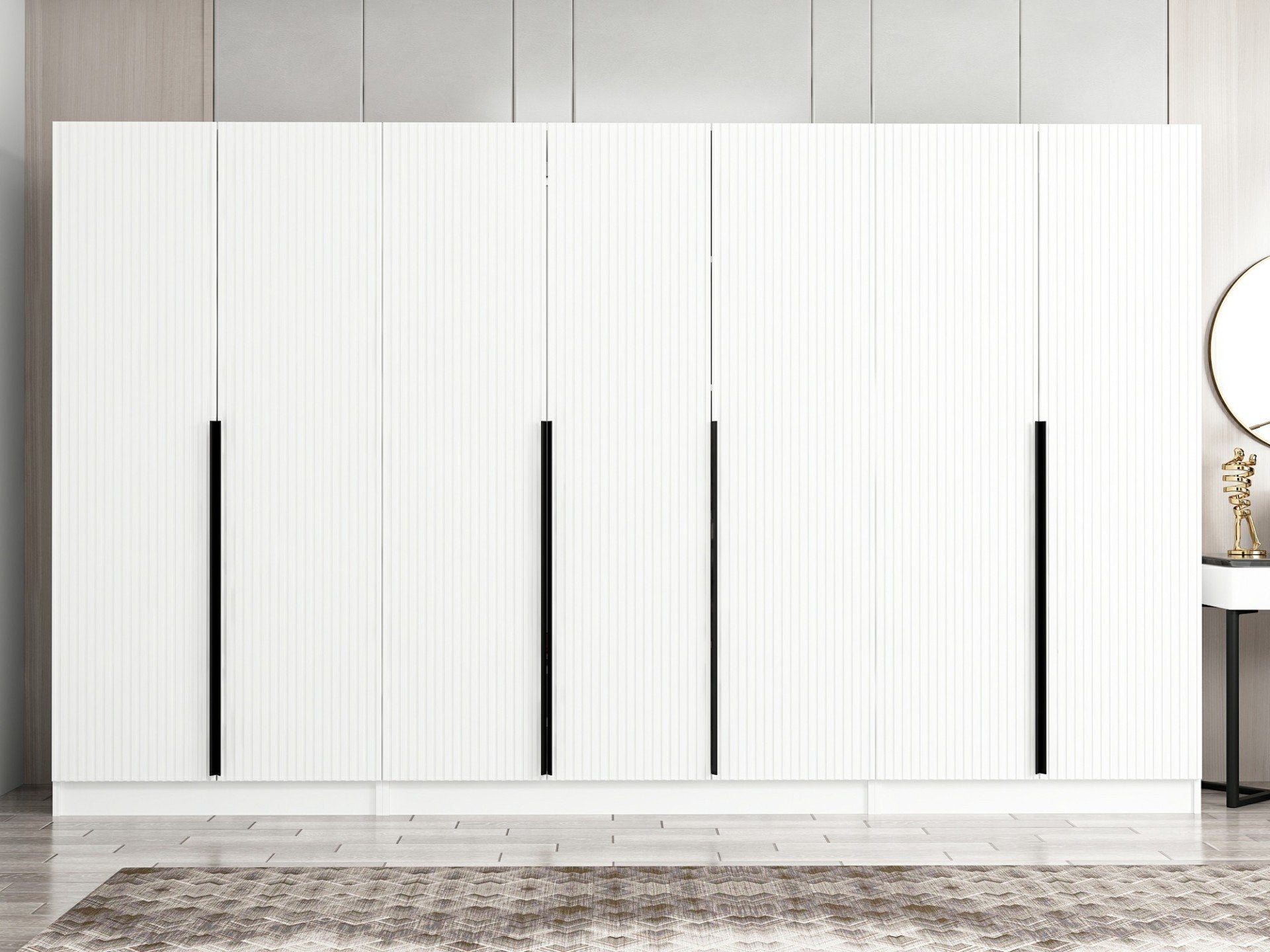 Com as suas dimensões generosas de 315 cm de largura, 210 cm de altura e 52 cm de profundidade, o nosso roupeiro oferece um espaço de arrumação amplo para todos os seus pertences. As numerosas prateleiras proporcionam uma arrumação prática para as suas roupas, sapatos, acessórios e muito mais, mantendo tudo bem organizado e facilmente acessível.