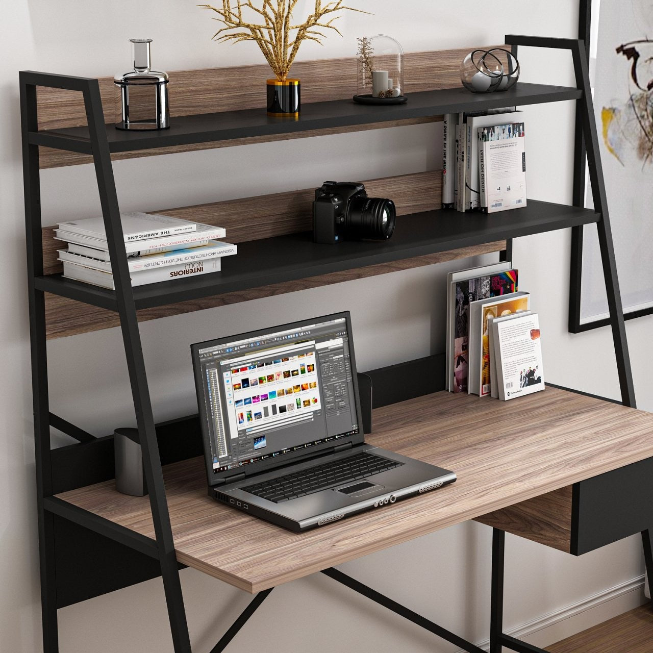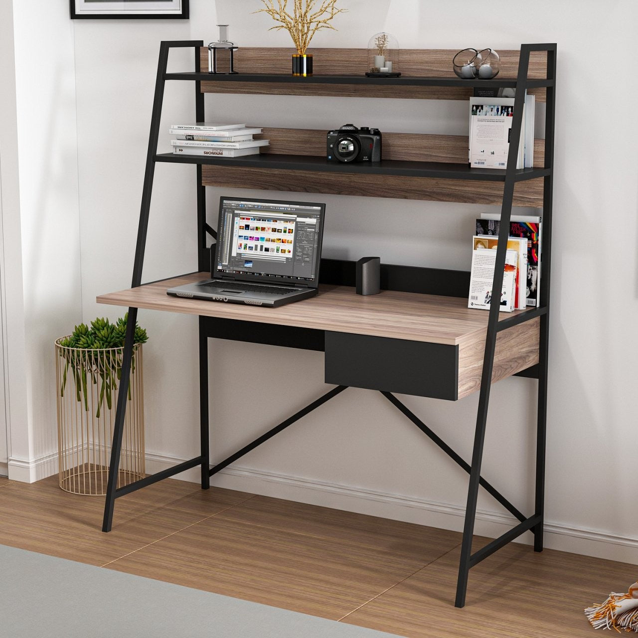 Com uma combinação moderna de cores nogueira e preto, a nossa secretária de estudo dá um toque de elegância a qualquer divisão. O design elegante combina na perfeição com a decoração existente, tornando-a uma escolha versátil para quartos, escritórios em casa ou dormitórios.