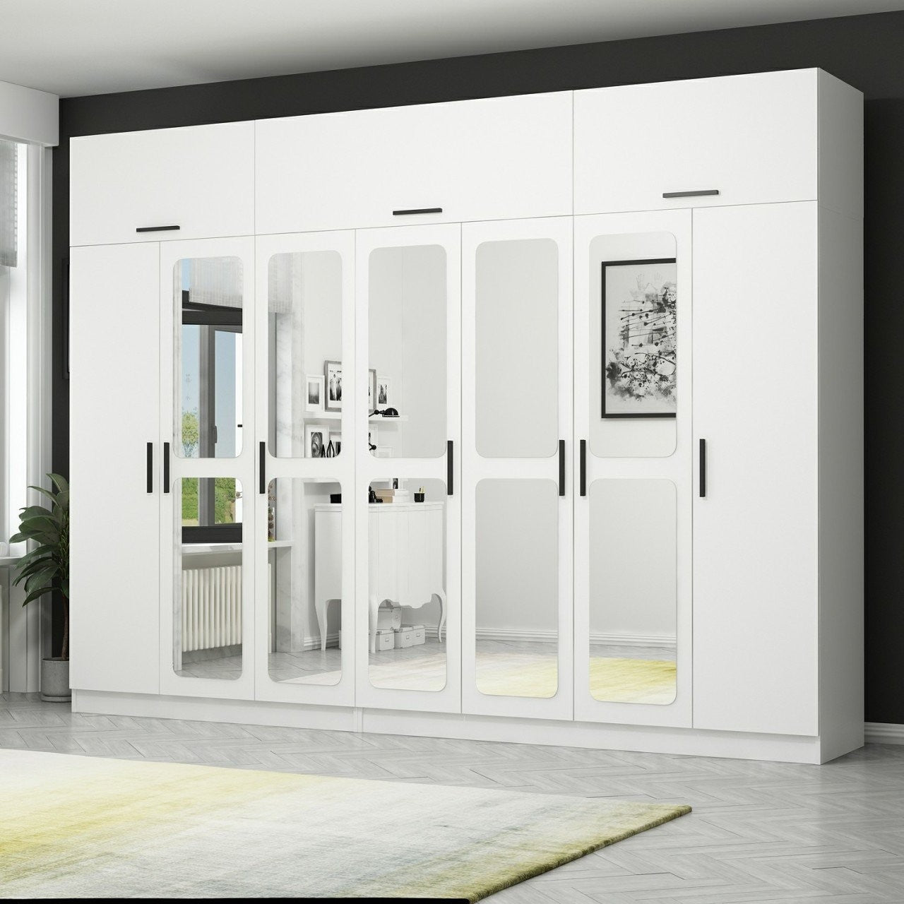 Com uma largura de 315 cm, altura de 255 cm e profundidade de 52 cm, este guarda -roupa oferece amplo espaço de armazenamento para todas as suas roupas, sapatos e acessórios. As inúmeras prateleiras oferecem muito espaço para organizar seus pertences, enquanto a opção de consertá -lo na parede garante estabilidade e segurança.